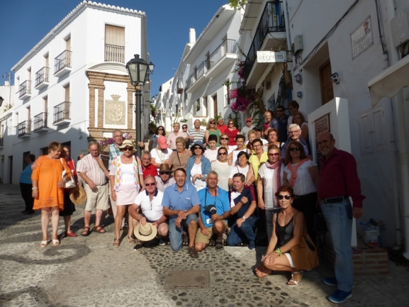 Desde Frigiliana, localidad de Málaga, y la Plaza de España de Sevilla saludan estos vecinos de Villoria, acompañados de amigos de otros municipios de Las Villas, como B