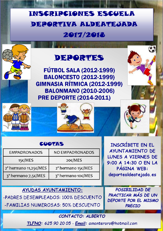 La Escuela Deportiva de Aldeatejada envió este lunes un comunicado en el que avisa de que aún hay plazas para inscribirse en la escuela deportiva y más concretamente en la disciplina deportiva del fútbol sala. Las categorías abiertas son las de benjamín (niños/as nacidos en 2009 y 2008); alevín (niños/as nacidos en 2007 y 2006); e infantil (niños/as nacidos en 2005 y 2004).