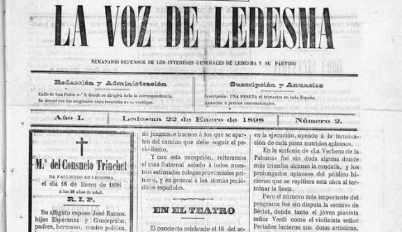 La hemeroteca de la villa nos lleva, de la mano de Monette González, hasta el 22 de enero de 1898, fecha que figura en la segunda tirada de La Voz de Ledesma (imagen adjunta al texto del semanario de la época), y en la que se hace una aclaración sobre la primera tirada y dice lo siguiente.