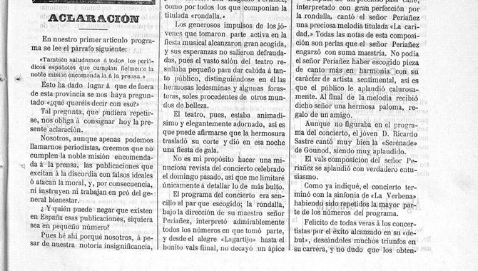 "En nuestro primer artículo programa se lee el párrafo siguiente: "También saludamos a todos los periodista españoles que cumplan fielmente la noble misión encomendada a la prensa.Esto ha dado lugar que de fuera de esta provincia se nos haya preguntado, ¿qué quereis decir con eso? Tal pregunta, que pudiera repetirse, nos obliga a consignar hoy la siguiente aclaración. Nosotros, aunque apenas podemos llamarnos periodistas, creemos que no cumples la misión encomendada a la prensa, las publicaciones que incitan a la discordia con falsos ideales o atacan la moral y, por consecuencia, ni instruyen ni trabajan en pro del general bienestar. ¿Y quién puede negar que existen en España esas publicaciones, siquiera sea un pequeño numero? Pues he ahí porque nosotros, a pesar de nuestra notoria insignificancia, no juzgamos buenos a los que se apartan del camino que deben seguir del periodismo.Y con esta excepción reiteramos el más fraternal saludos a nuestros estimados colegas provinciales primero, y en general a todos los periodistas españoles".
