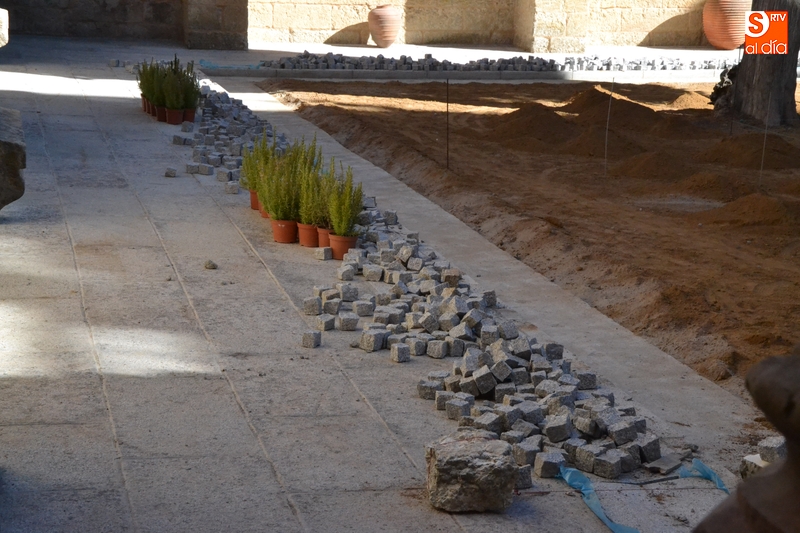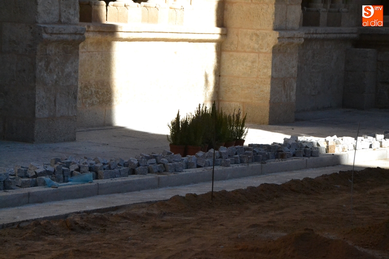 El Claustro de la Catedral ultima su restauración, en la que se ha recuperado el antiguo jardín   | Imagen 2En la mañana del martes ?como se puede ver en las imágenes-, en la parte central todavía dominaba la tierra, estándose a la espera de que se planten ?en torno a los 4 grandes cipreses, que se mantienen- unas cuantas especies aromáticas que recibirán agua mediante un nuevo sistema de riego que también se ha instalado. A la hora de unir la zona de losetas de granito y el jardín propiamente dicho se ha habilitado una canaleta para la recogida de aguas, una de las prioridades a la hora de hacer todas las obras de restauración.
