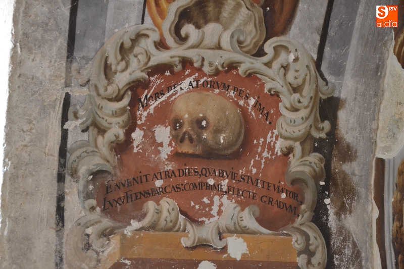 El Claustro de la Catedral ultima su restauración, en la que se ha recuperado el antiguo jardín   | Imagen 3De igual modo, también se han hecho acciones de rejuntado en los muros, se han limpiado los paramentos, se han nivelado las losas sepulcrales, se ha recuperado la geometría original de la puerta que da hacia la Plaza de Amayuelas, se ha actuado en las puertas de madera (se han pintado y cambiado herrajes), y como hecho más destacado, ha aparecido una pintura que parece que fue realizada en el siglo XVIII. Esa pintura cuenta con textos hablando de la muerte de los pecadores y de los justos, y curiosamente, en algún momento de la historia, recibió perdigonazos.