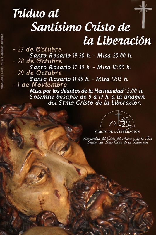 La Hermandad del Cristo del Amor y de la Paz celebra del 27 al 29 de octubre un triduo en honor al Santísimo Cristo de la Liberación. En concreto, los actos comienzan este viernes, 27 de octubre, a las 19.30 horas en la capilla del cementerio San Carlos Borromeo, con el rezo del rosario y una eucaristía a las 20:00. El sábado, 28 de octubre, será a las 17:30 horas y el domingo, 29, a las 11.45 horas.