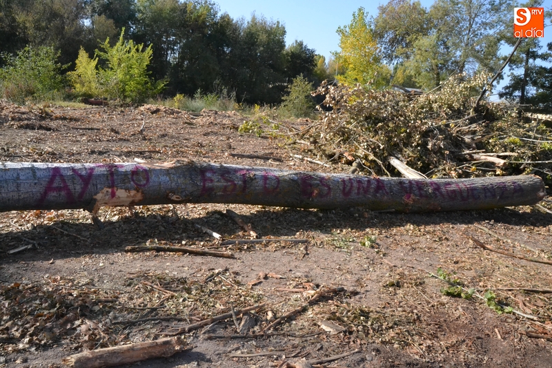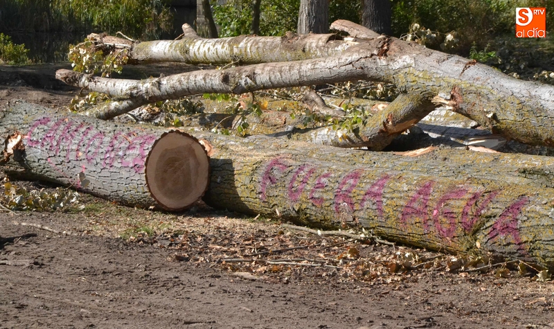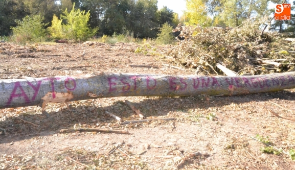 Concretamente, en el tronco de uno de los árboles cortados en las Tenerías se ha escrito un mensaje con letras mayúsculas que reza Ayto esto es una vergüenza. El mensaje se ha escrito con un spray morado, prácticamente el mismo color (sino el mismo) que el usado para señalar con una 'X' los árboles a cortar en las distintas zonas.