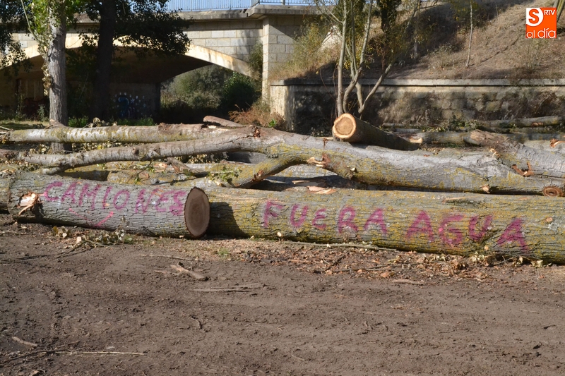 A escasos metros, se puede encontrar otro mensaje en otro tronco (que ya ha sido cortado en varias partes), que reza exactamente Camiones Fuera Agua, que parece que se refiere a la operación que ha estado llevando a cabo -al menos- un camión varias mañanas en la zona del Águeda que da a las Tenerías.