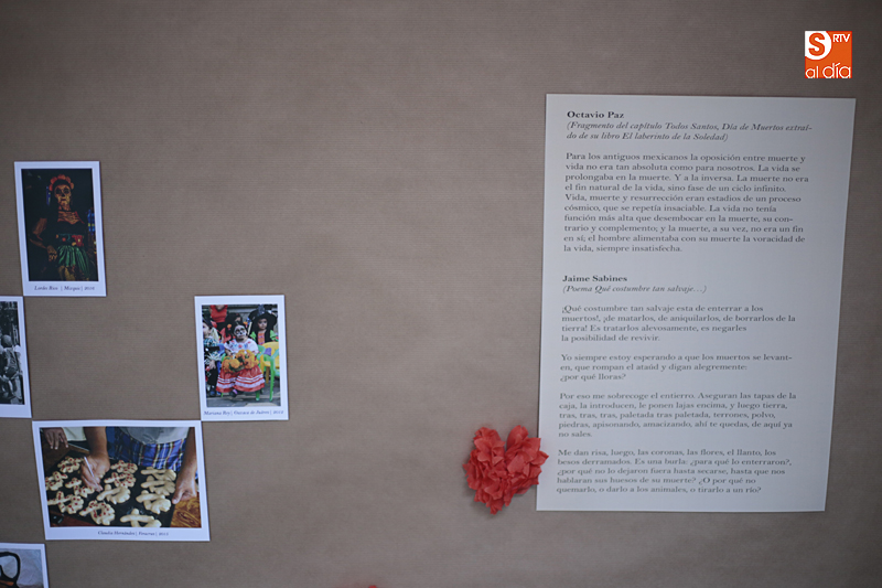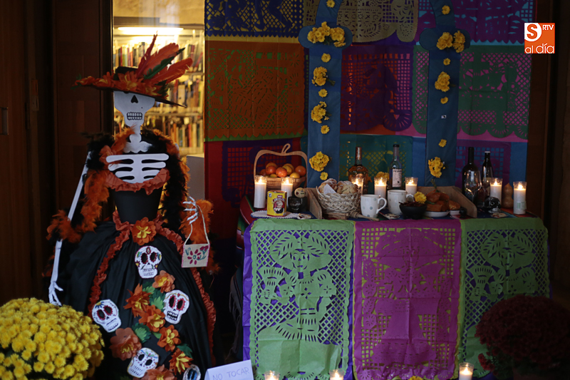 'Altar de Muertos'; los altares y ofrendas del Día de los Muertos en México está realizado por Claudia Adriana Hernández Suárez. La inauguración está programada para este lunes y la organización esperaba contar con Ramona Domínguez Sanjurjo, directora de la Biblioteca Casa de las Conchas. Asistieron Mercedes García Montero, la directora del Instituto de Iberoamérica, Claudia Adriana Hernández Suárez, doctora en Ciencias Sociales del Instituto de Iberoamérica de la Universidad de Salamanca y las organizadoras del evento. Esta muestra 'De Corazón Mexicano: Entre la risa y el llanto', se podrá visitar desde el 30 de octubre al 12 de noviembre de 2017.