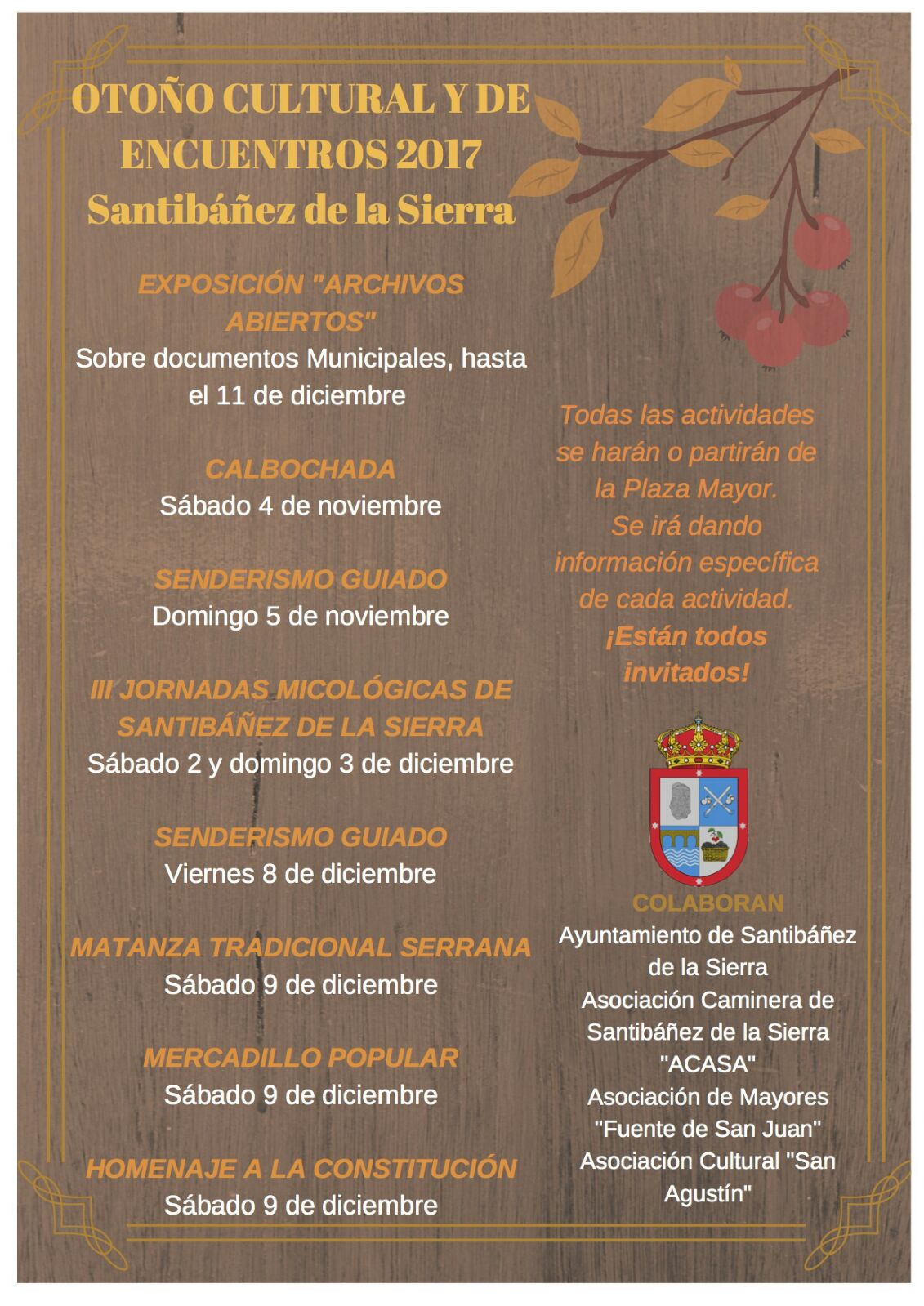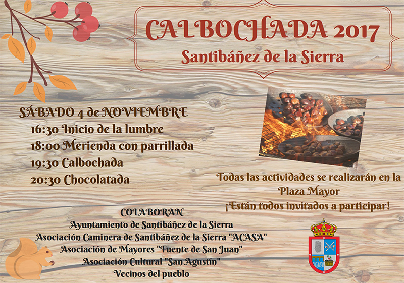 El otoño cultural y de encuentros es una propuesta del Ayuntamiento de Santibañez de la Sierra, con la colaboración de la Asociación Caminera de Santibañez de la Sierra (ACASA), la Asociación de Mayores Fuente de San Juan y la Asociación Cultural San Agustín.