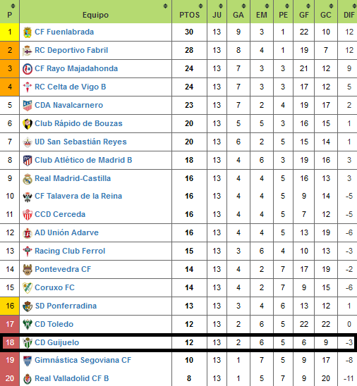 A pesar de rescatar un punto en su visita al Navalcarnero gracias a un tanto de Jonathan Martín, el CD Guijuelo continúa una semana más en puestos de descenso a Tercera División. De hecho pierden un puesto tras la victoria de la Ponferradina. Eso sí, hay seis equipos en tres puntos, por lo que una victoria puede hacer variar bastante la clasificación. En esos puestos hay algunos equipos históricos como el Tole