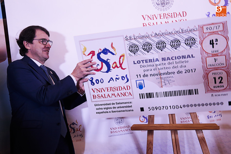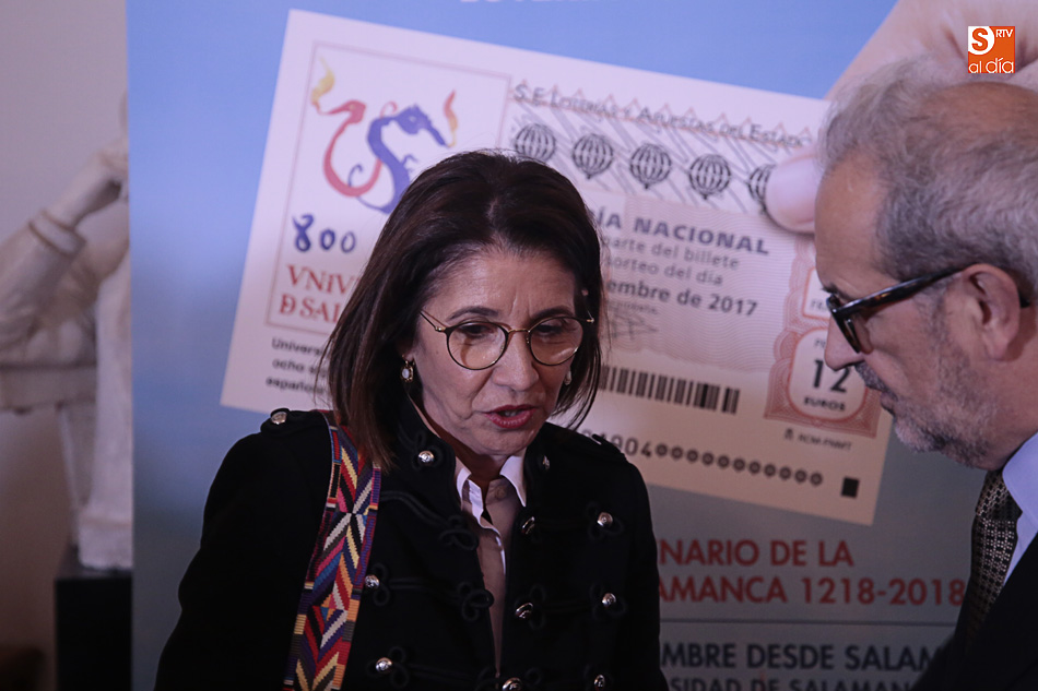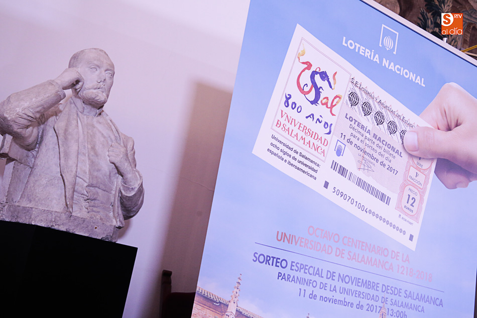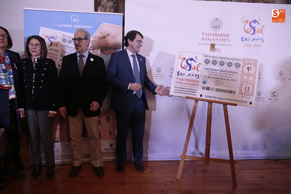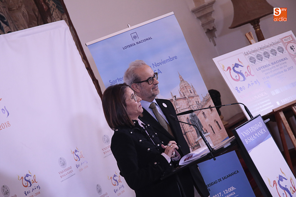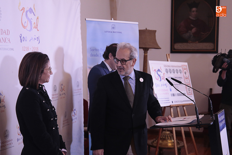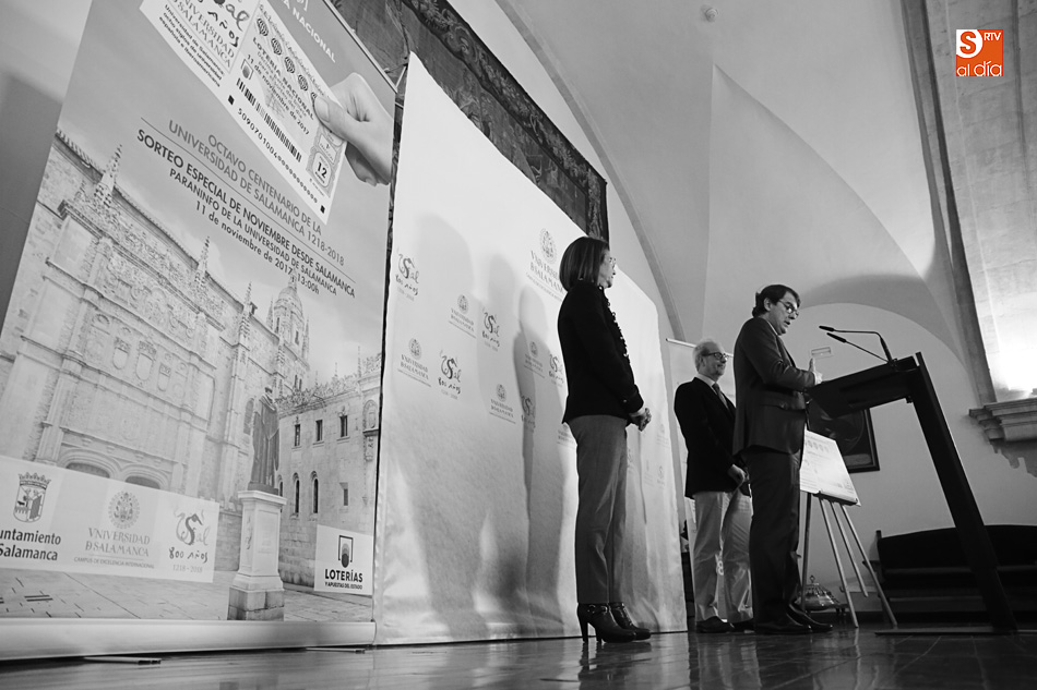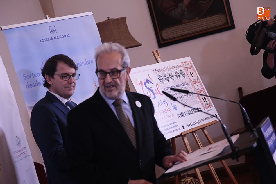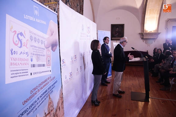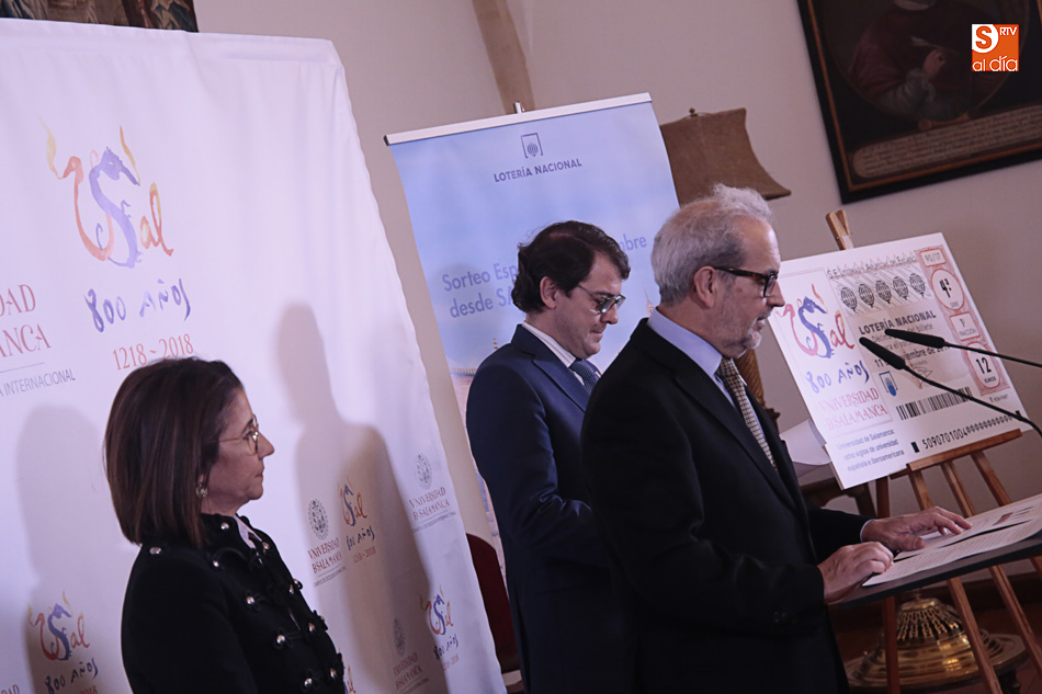 El rector de la Universidad de Salamanca, Daniel Hernández, el alcalde de Salamanca, Alfonso Fernández Mañueco y la presidenta de Loterías y Apuestas del Estado, Inmaculada García, presentaron hoy ese sorteo. Retransmitido por Televisión Española, incluye la participación de varios niños del colegio Padre Manjón y una breve actuación musical del Coro de la Universidad de Salamanca en los instantes posteriores al sorteo.