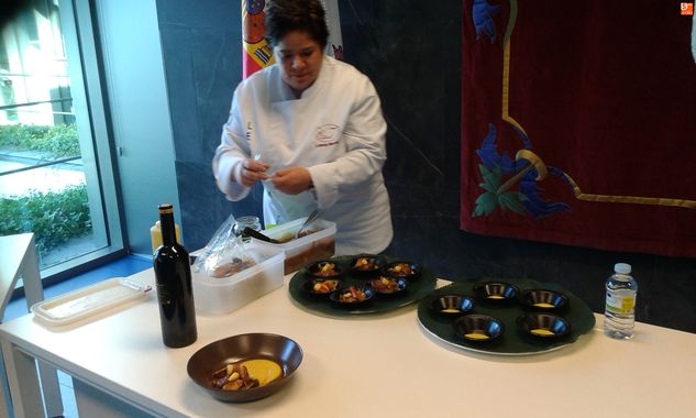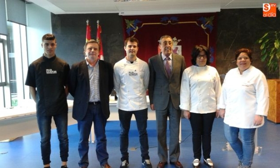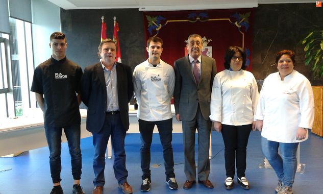 El delegado de la Junta, Bienvenido Mena, acompañado de María Luz Lorenzo, delegada de Euro-toques en Salamanca; y de los cocineros Francisco Javier Fuster, del restaurante Rúa Mayor de la ciudad y Leticia Martín, del Estoril de Ciudad Rodrigo, ha destacado el éxito de una iniciativa "consolidada" y un referente gastronómico que ha contado con demostraciones en directo durante la presentación.