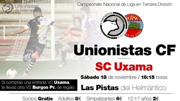 Unionistas defenderá el liderato este sábado en Las Pistas a partir de las 16.15 horas frente al Sporting Uxama, club representativo de El Burgo de Osma. Para este partido el club ha preparado su particular 'Black&White Friday', de tal manera que todas aquellas personas que compren una entrada, recibirán otra de regalo de la misma categoría o inferior para el siguiente encuentro en casa ante el Burgos Promesas, que se disputará dos fines de semana después.