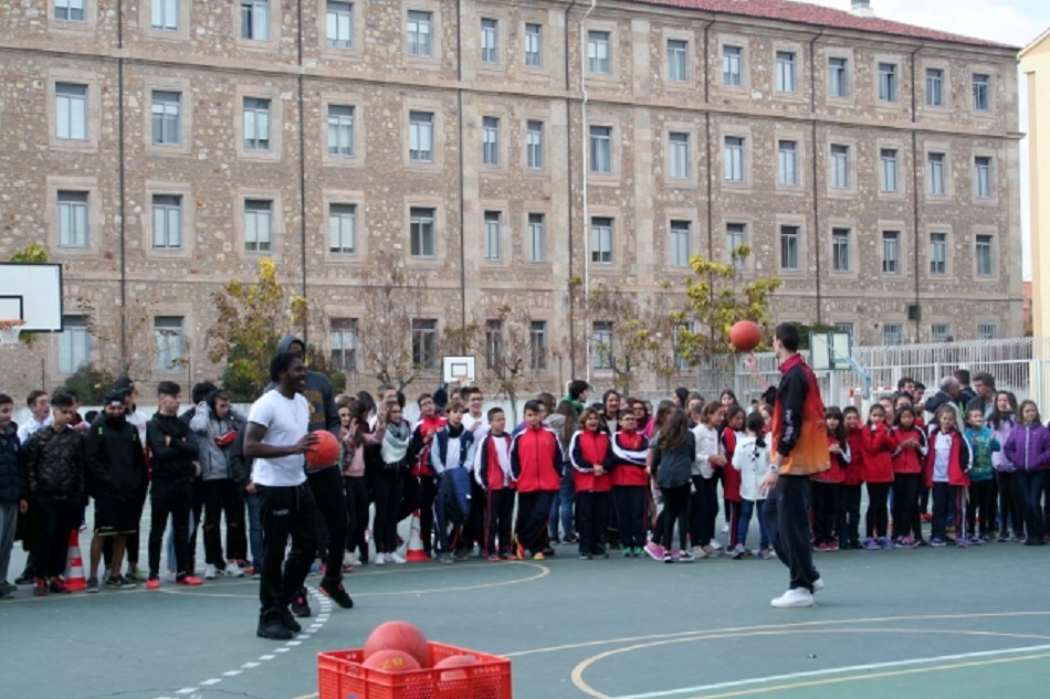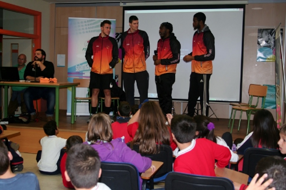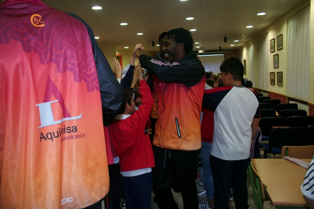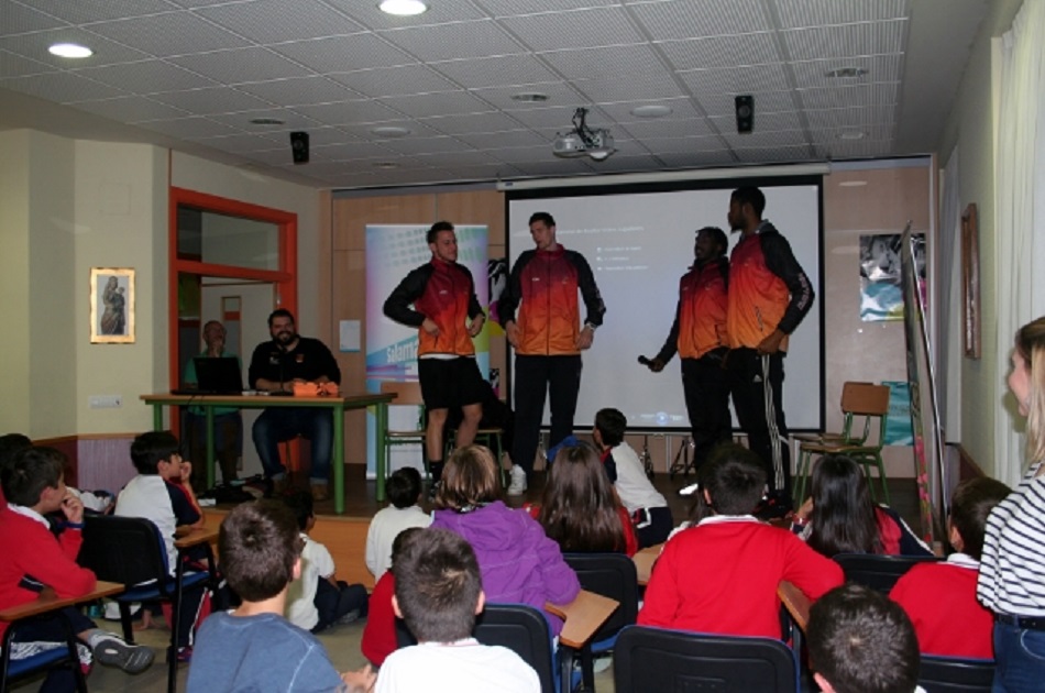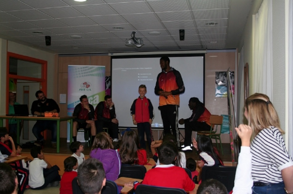 Víctor Rico, entrenador del equipo, en primer lugar, presentó a los jugadores: Francisco Imobach Pomares, Aleksandar Rac, Jalen Pendleton y Enouma Ebinum, y a continuación explicó de forma didáctica, apoyándose en material audiovisual, la importancia del deporte y los hábitos saludables a los alumnos de 5º y 6º de E. Primaria.