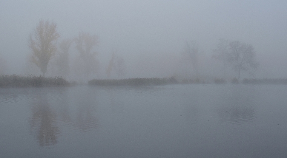 La niebla difumina el espacio y lo vuelve irreal y tan hermoso, como aquí ocurre con la línea del paisaje y de los árboles, ante el espejo de las aguas.