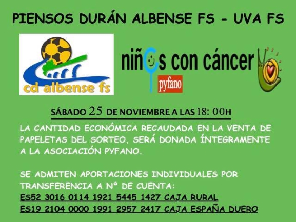 La solidaridad alcanzará el partido de este sábado a las 18:00 horas entre el Piensos Durán Albense y la Universidad de Valladolid. Esto es debido a que el Club Deportivo Albense destinará todo el dinero recaudado por la venta de papeletas para el sorteo posterior al partido a la asociación Pyfano (Asociación de Padres, Familiares y Amigos de Niños Oncológicos).