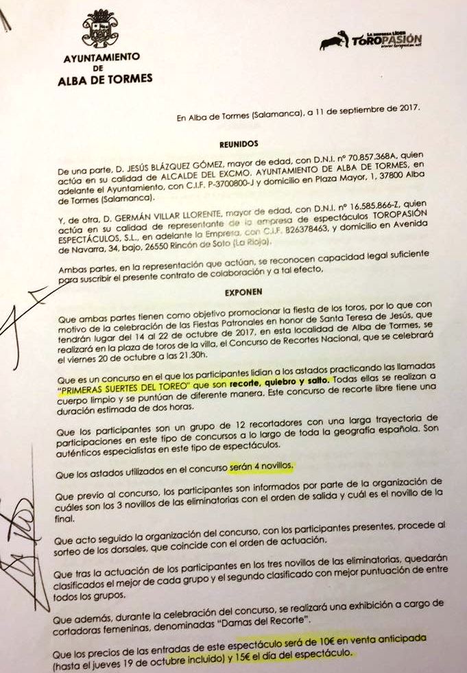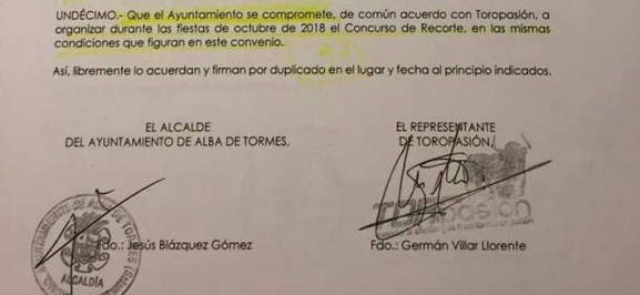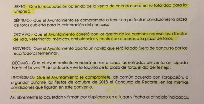 "Que el ayuntamiento se compromete de común acuerdo con Toropasión, a organizar durante las fiestas de octubre de 2018 el concurso de recorte, en las mismas condiciones que figuran en este convenio".