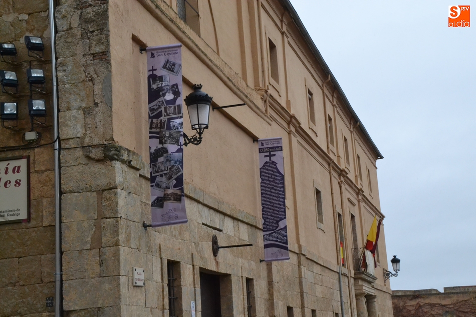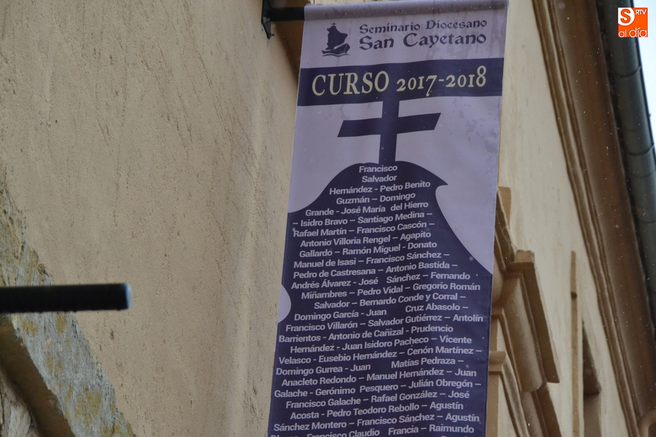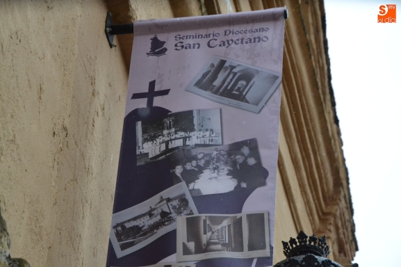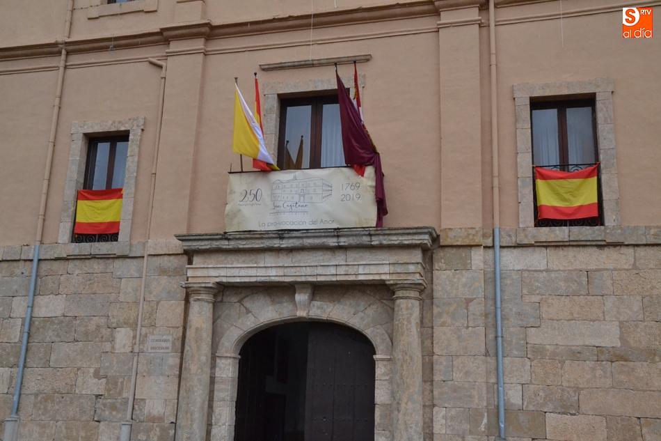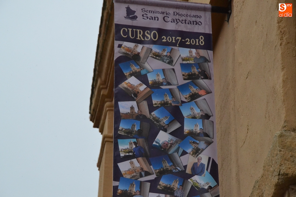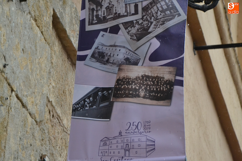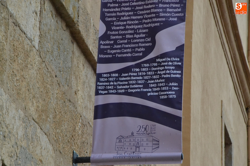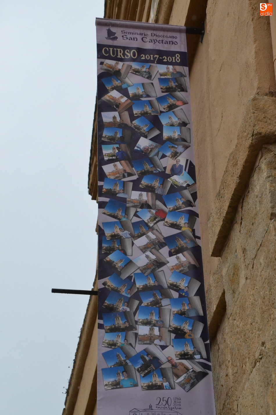 Las celebraciones del Seminario Diocesano San Cayetano de Ciudad Rodrigo tanto por su patrón como por su 250 aniversario se han hecho visibles en la calle mediante una serie de elementos colocados en la fachada principal de la institución, la que da a la Plaza de Herrasti.