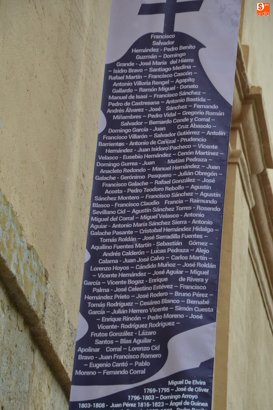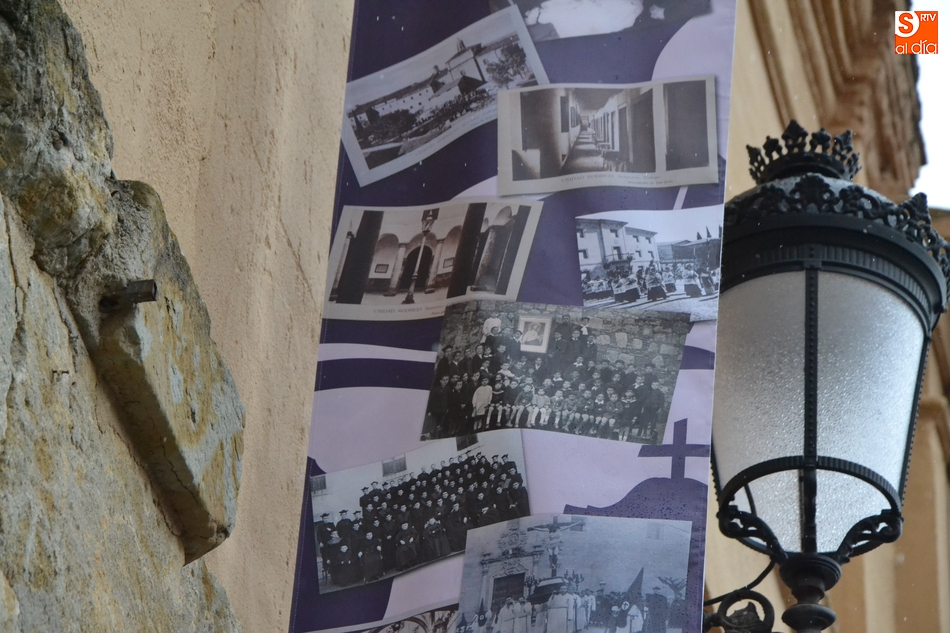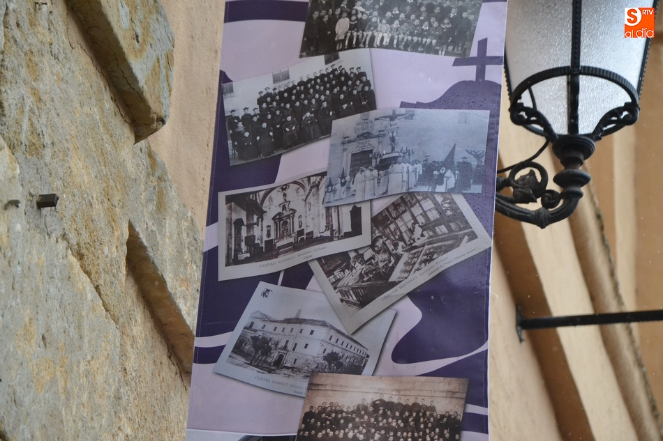 Por otro lado, justo encima de la entrada desde la calle a la Capilla Mayor del edificio se colgaron en la mañana del lunes dos lonas (a la que se unirá alguna más), donde se muestran una serie de fotografías y nombres de personas de la dilatada historia del Seminario.