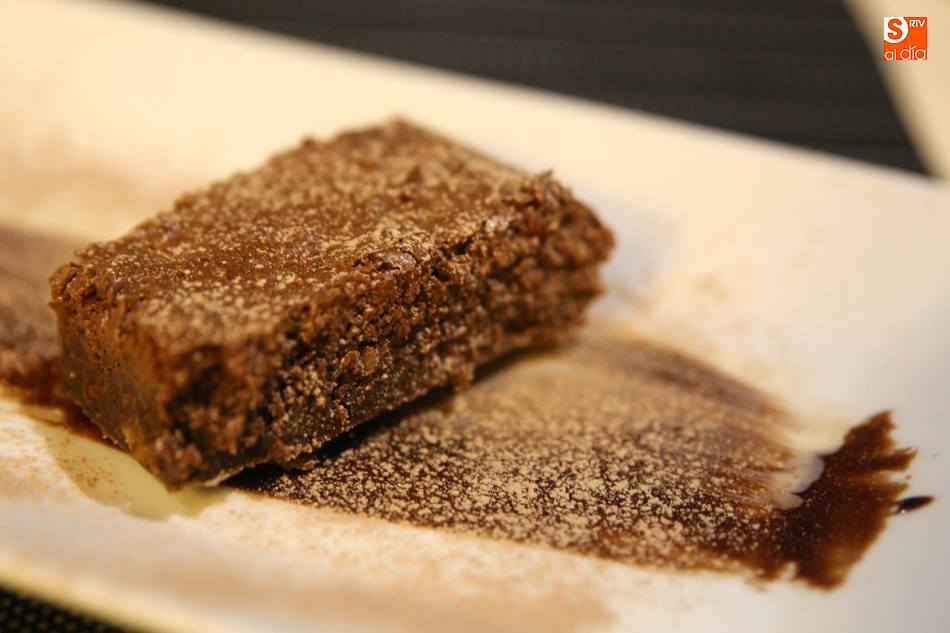 Brownie de chocolate negro con helado mascarpone y almendra garrapiñada