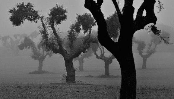 Cuando llega el invierno, la niebla se abre paso y ocupa los espacios que le pertenecen. Este de las encinas es muy suyo. La resistencia de los árboles, en medio de ese vaho lechoso que trata de difuminarlos, queda subrayada por unos troncos poderosos que se resisten a desaparecer.