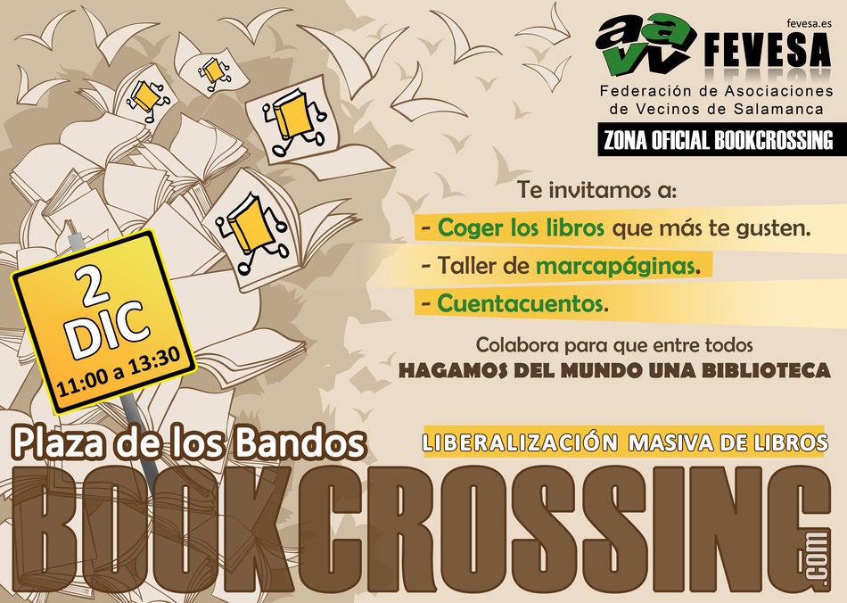 Este sábado día 2 de diciembre FEVESA estará una vez más en la Plaza de los Bandos para acercar el fenómeno bookcrossing a los vecinos de Salamanca en horario de 11 a 13:30 horas. Además del intercambio de libros se realizará un taller de marcapáginas y habrá un cuentacuentos que pretenderá fomentar hábitos de lectura y despertar el interés por los libros entre lo más pequeños.