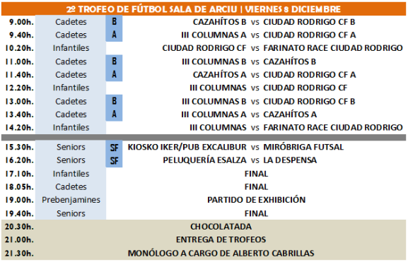 En la primera de ellas, habrá sólo 3 equipos, uno del III Columnas, otro del Ciudad Rodrigo CF, y el equipo femenino Farinato Race Ciudad Rodrigo FS, que jugarán todos contra todos a lo largo de la mañana (10.20h., 12.20h, y 14.20h.). Los dos mejores equipos de la mañana jugarán la final de esta categoría a las 17.10 horas.