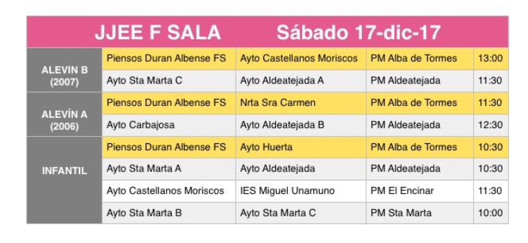 Los Juegos Escolares regresan este fin de semana para los tres equipos de fútbol sala del Club Deportivo Albense después del parón por el puente vacacional del fin de semana pasado. Una nueva jornada liguera para los dos conjuntos Alevín y para el Infantil que discurrirá la mañana del sábado en Alba de Tormes.