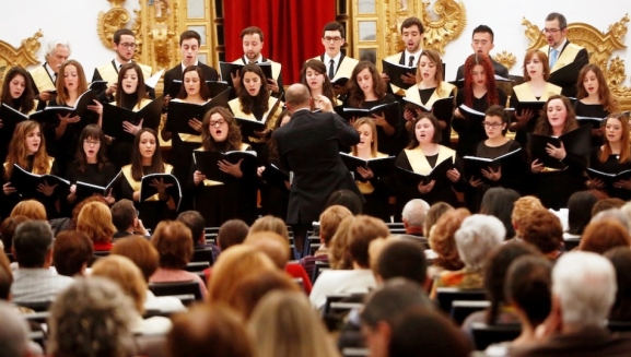La Iglesia del Carmen, en la Plaza de los Bandos, acogió este jueves a las 20.30 horas, y con una gran presencia de público, el concierto de Navidad del coro Tomás Luis de Victoria, de la Universidad Pontificia de Salamanca.