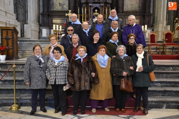 A la conclusión, los miembros de la Peña se hicieron la habitual foto de familia en la escalera del altar, con sus pañuelos azules anudados al cuello, junto al párroco. La reunión invernal de la Peña La Alegría continúa a la hora de publicarse esta información en el Hotel Conde Rodrigo I, donde están disfrutando de una comida conjunta que dará paso a una animada sobremesa.