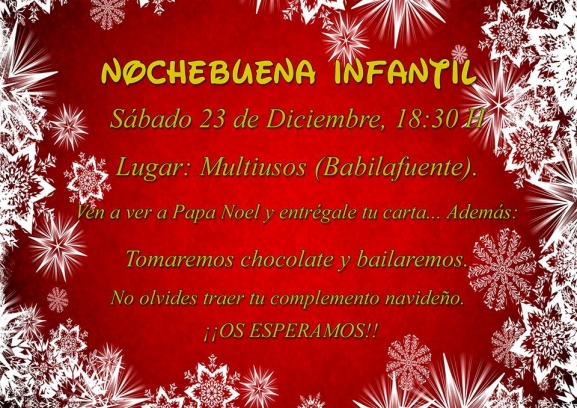 En la Nochebuena infantil, que comenzará a las 18:30 horas, Papá Noel recogerá las cartas de los niños y escuchará sus peticiones. Para animar la fiesta, los organizadores animan a llevar complementos navideños. Además, los asistentes podrán tomar un rico chocolate y bailar.