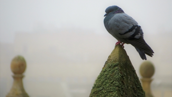 Atmósfera de niebla y de pináculos. Todo se halla en esta altura, como fuera del mundo. La paloma, en equilibrismo celeste, existe en su quietud, aquí fuera del vuelo, ensimismada frente a todo transcurrir, como si nada fuera con ella.