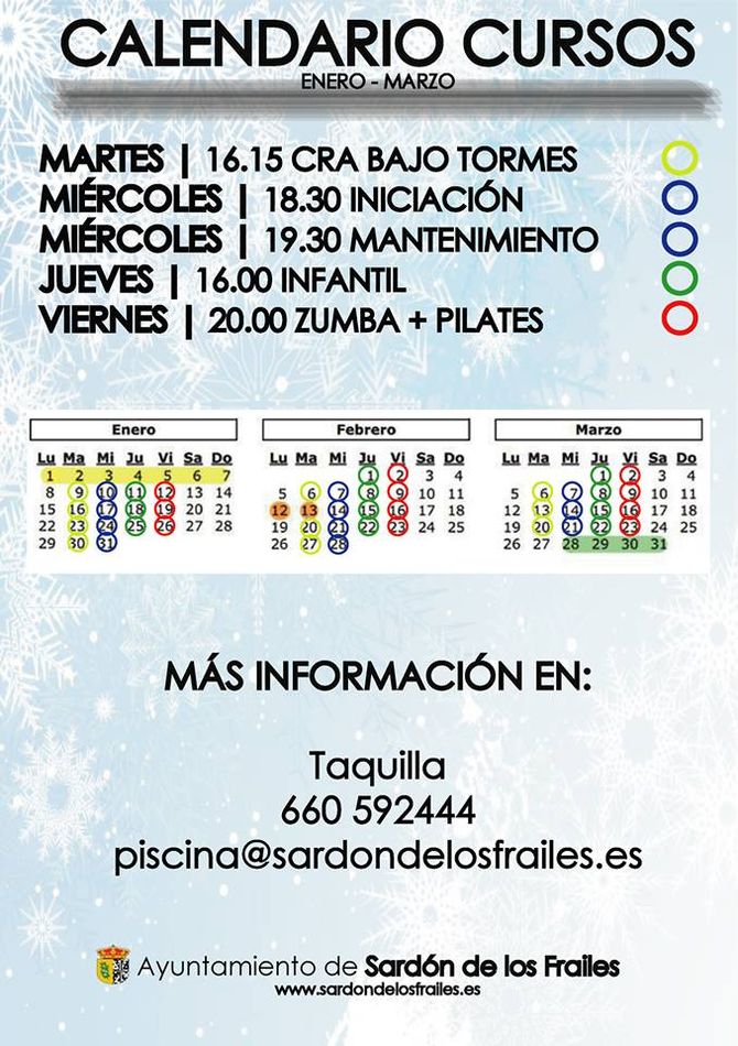 En el caso de los cursos, se unifica el precio, pero se establecen varias condiciones para los usuarios a los que se les hará entrega de un calendario trimestral que comprende las clases a impartir. El coste de la sesión de todos los cursos es de 4 euros, siendo obligatorio hacer el pago de manera mensual, aunque se habilita la opción de pago trimestral con una mejora del precio de sesión, que quedaría fijado en 11 sesiones en todos los cursos por 40 ?, con lo que habría un descuento de 4 ?.