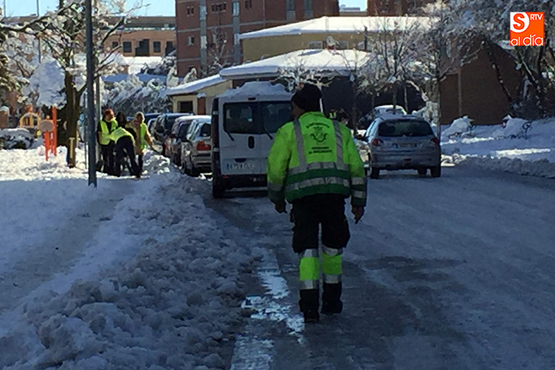Tal y como anunciaba el Ayuntamiento de Peñaranda, todos los operarios municipales centraban su actividad desde primeras horas de este lunes en tratar de limpiar y echar sal en calles y plazas para eliminar la máxima cantidad de nieve y hielo acumulados tras más de 24 horas de intenso temporal.