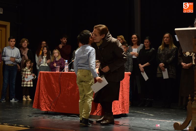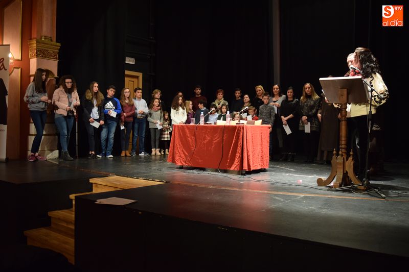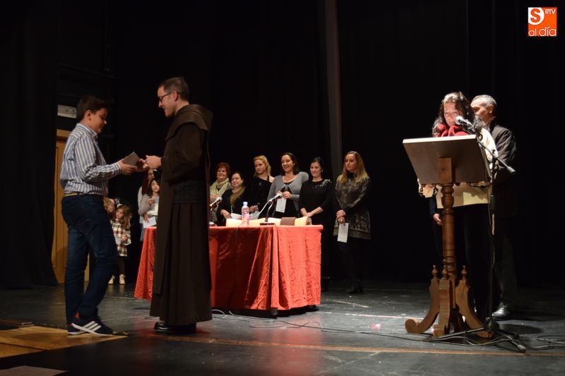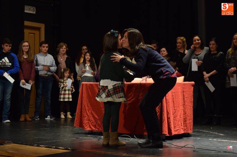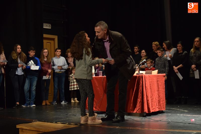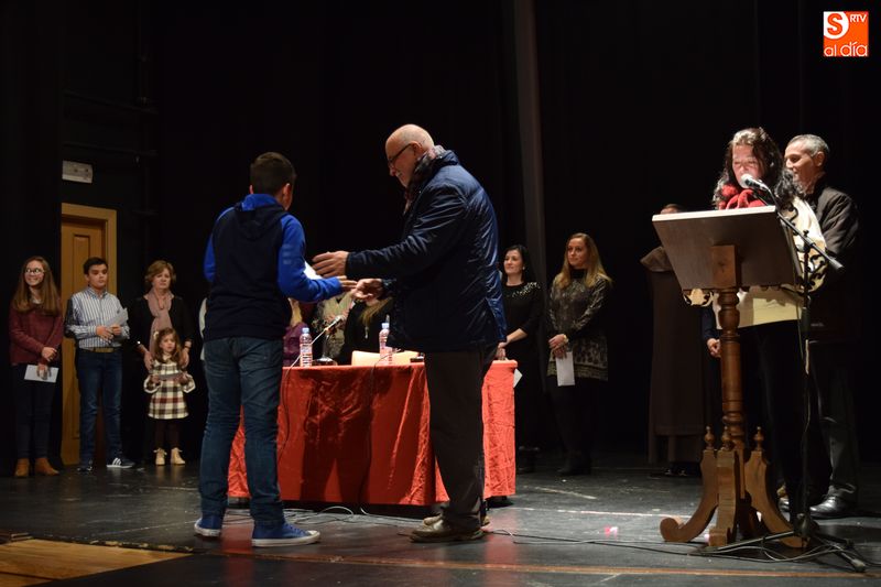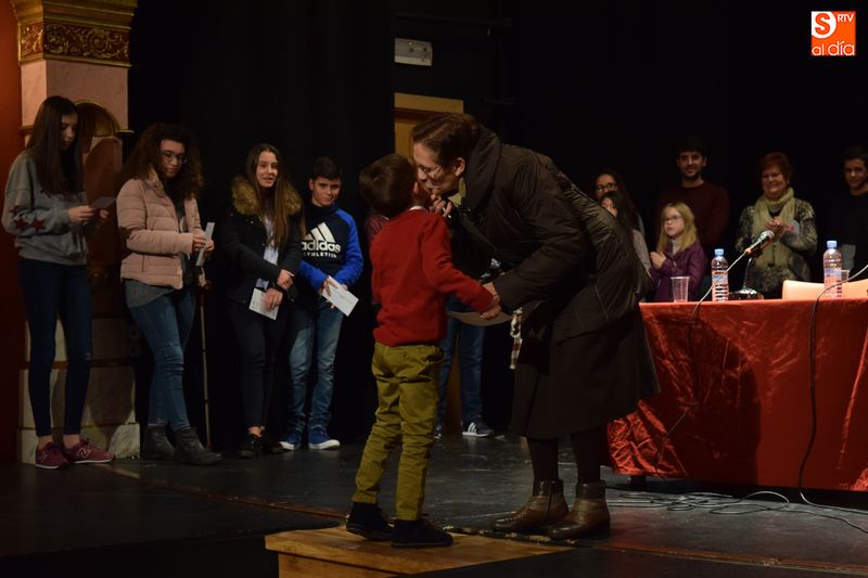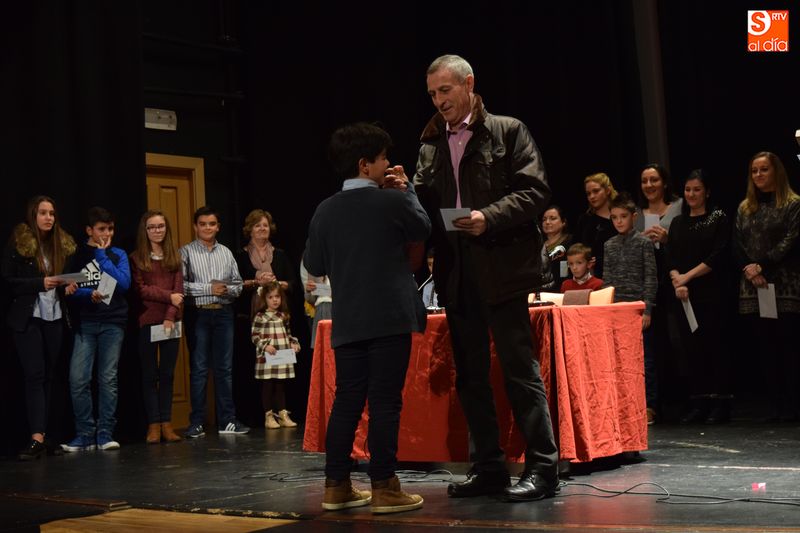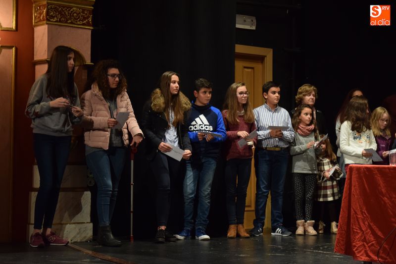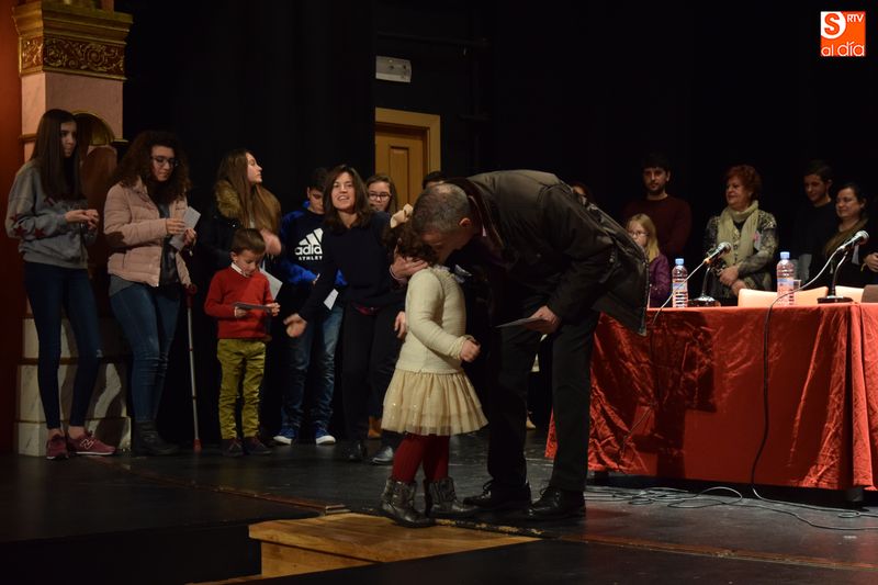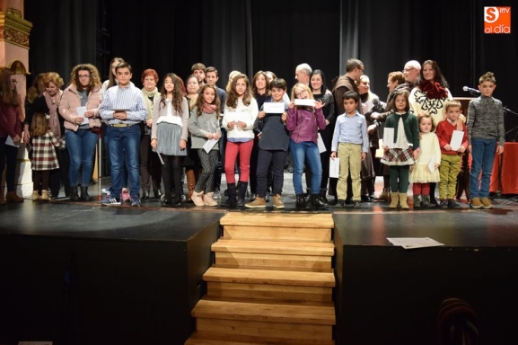 ganadores de los concursos de coronas, escaparates, centros, cuentos y redacciones escolares navideñas fueron subiendo uno a uno al escenario del teatro para recibir su premio de manos de las autoridades del Ayuntamiento y personas que forman parte del equipo de trabajo del Año Jubilar Teresiano.