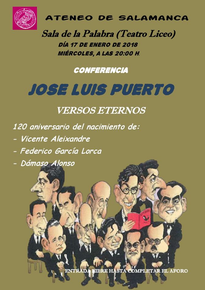 El escritor salmantino José Luis Puerto ofrecerá este miércoles, 17 de enero, una charla sobre tres poetas de la Generación del 27 (Vicente Aleixandre, Federico García Lorca y Dámaso Alonso), con motivo del 120 aniversario de sus respectivos nacimientos, bajo el título 'Versos eternos'.