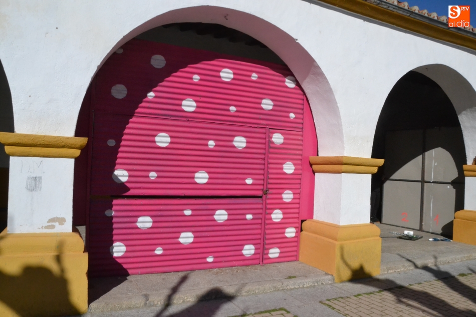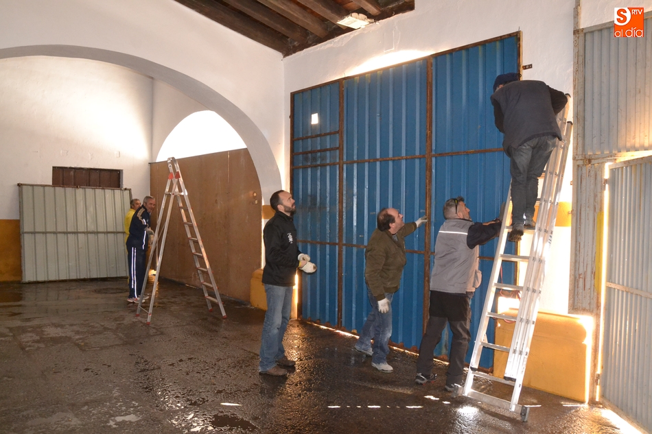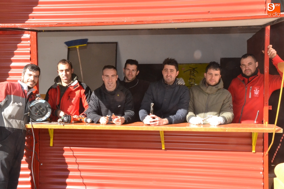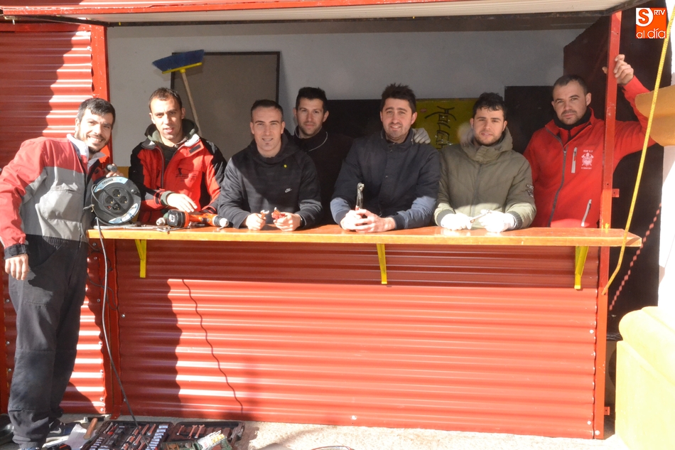 Tras instalar la Agrupación Peña de Francia su llamativa chapa exterior de color rosa con topos blancos, las peñas que estuvieron trabajando durante la mañana del sábado en la Plazuela fueron las peñas de Los Kolgaos y La Polémika, empezando por colocar la estructura exterior y las 'paredes' laterales de las casetas.