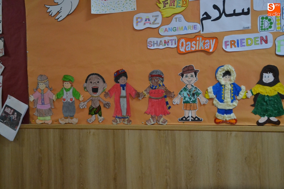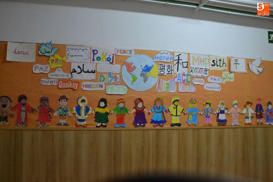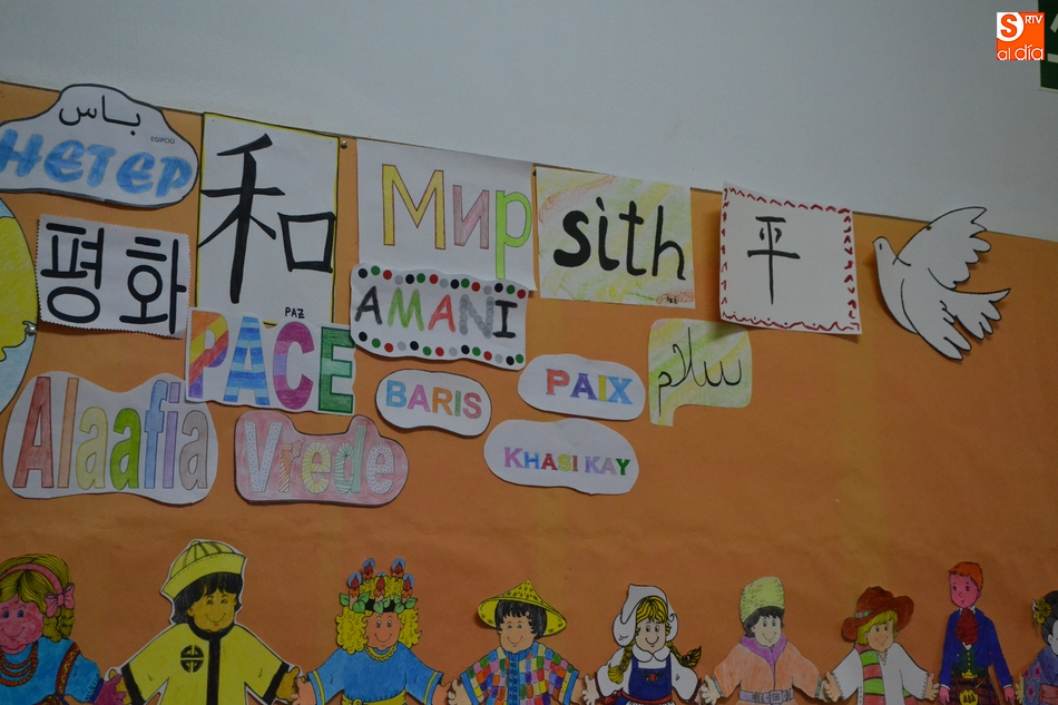 La conmemoración en el Colegio San Francisco fue doble. Por un lado, se creó un mural en los pasillos del colegio, con una bola del mundo en el centro en torno a la cual se fue colocando la palabra 'Paz' escrita en diversos idiomas, así como dibujos de niños de distintas culturas y países, todos ellos unidos de la mano.