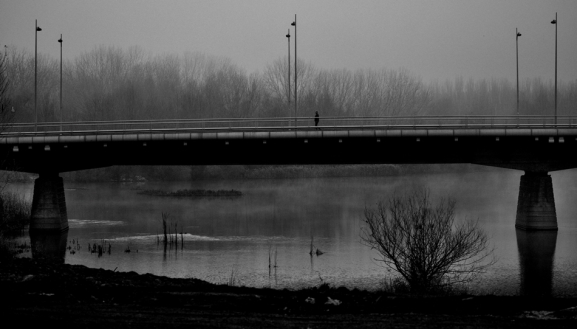 Pese a no percibirlo, hoy vivimos un tiempo de libertad de los puentes. Ese transeúnte que cruza el de la imagen lo hace sin traba alguna. Lo acompaña el invierno, la atmósfera de niebla. Y esa simetría de la imagen lo protege.
