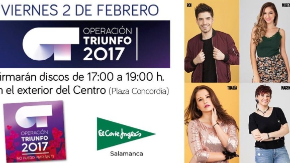 Los cuatro concursantes de Operación Triunfo, que se encuentran ya fuera de la Academia, visitarán Salamanca para firmar ejemplares de 'Operación Triunfo 2017: Lo Mejor' y 'Operación Triunfo 2017: Duetos', además del disco 'Edición San Valentín: No puedo vivir sin ti', que sale a la venta mañana viernes 2 de febrero.