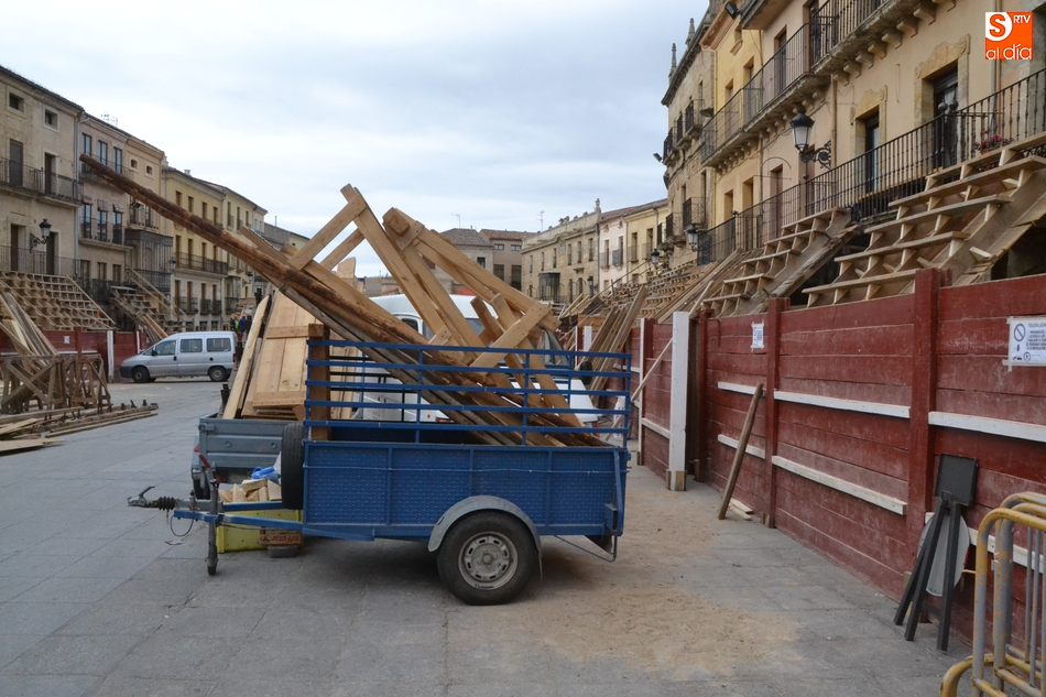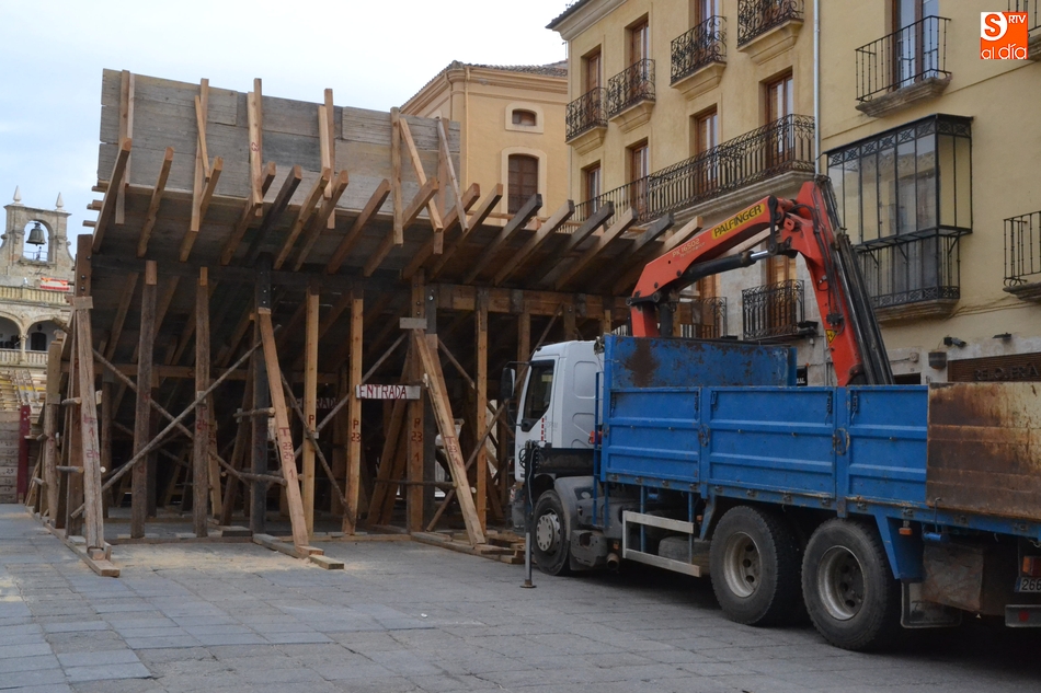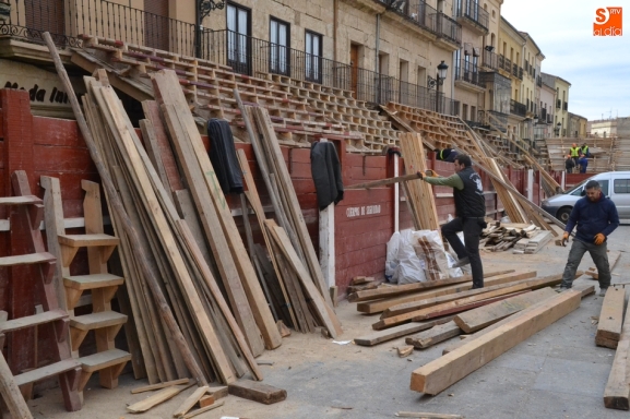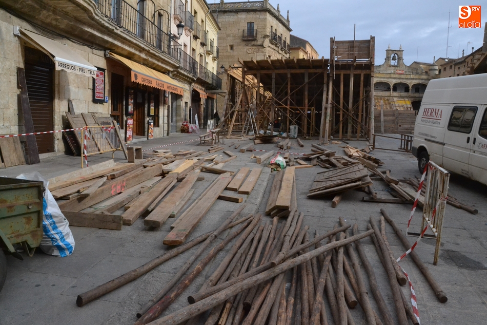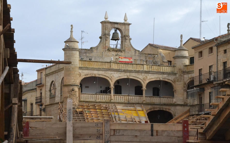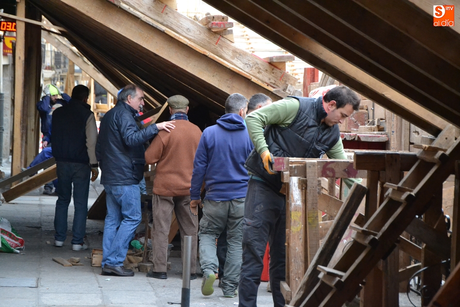 Ni la hora de comer, ni el hecho de que cientos de mirobrigenses estuvieran de peregrinación hasta el Monasterio de La Caridad para festejar a San Blas, hizo que se detuviese en la jornada sabatina el montaje de los tablaos en la Plaza Mayor de Ciudad Rodrigo, que a la hora de tomarse las fotografías que acompañan estas líneas (pasados pocos minutos de las 15.00 horas), ya marchaba muy avanzado.