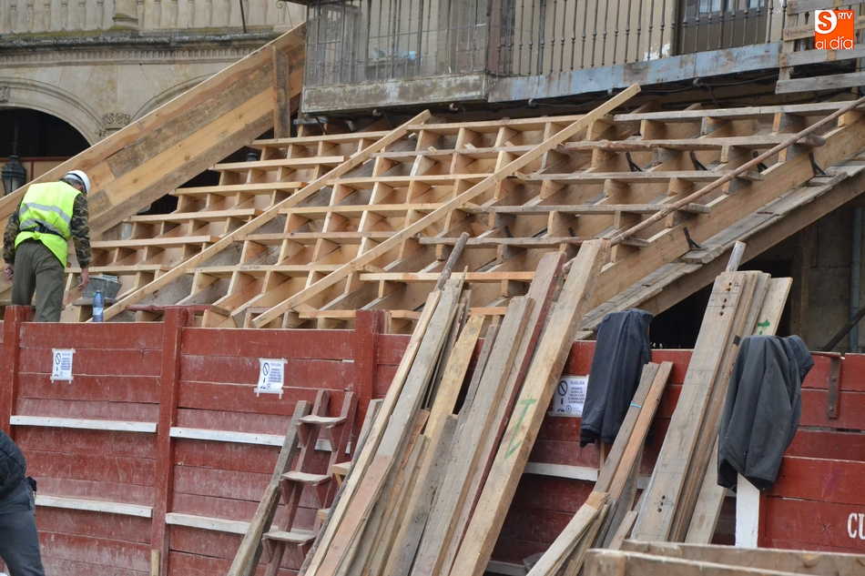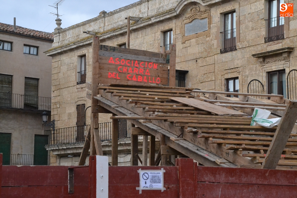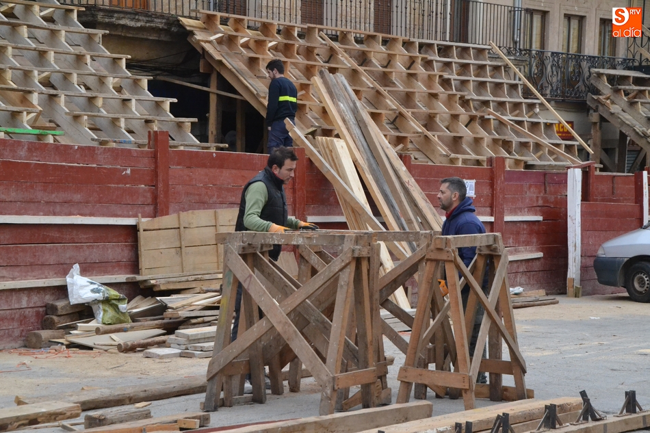Tras iniciarse los trabajos en la tarde del viernes, la mañana del sábado fue muy intensa, con movimiento continuo en los cuatro laterales del coso, conformando una espectacular coreografía de maderas, tacos, puntas y martillos que maravilló a todos los que se dieron una vuelta por allí para contemplar una de las grandes peculiaridades del Carnaval del Toro mirobrigense.