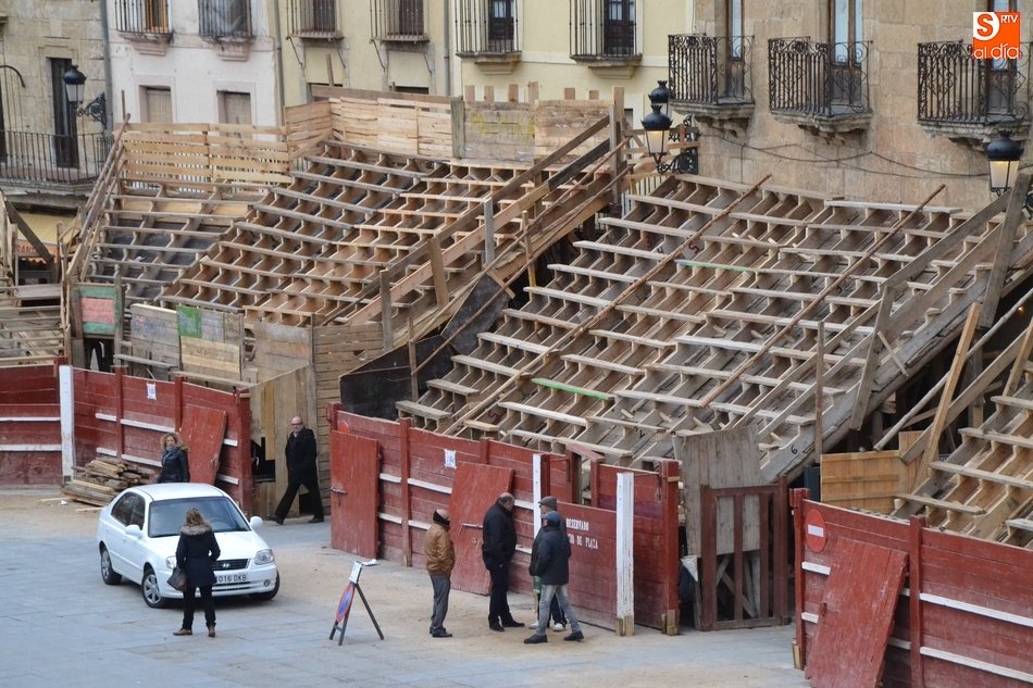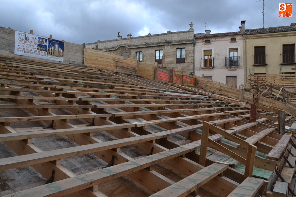 Los 47 tablaos que conforman el coso taurino que se monta en Ciudad Rodrigo cada Carnaval ya presiden imponentes la Plaza Mayor mirobrigense tras ser levantados en los últimos días en una delicada obra de ingeniería artesanal que un año más ha vuelto a despertar mucha expectación.