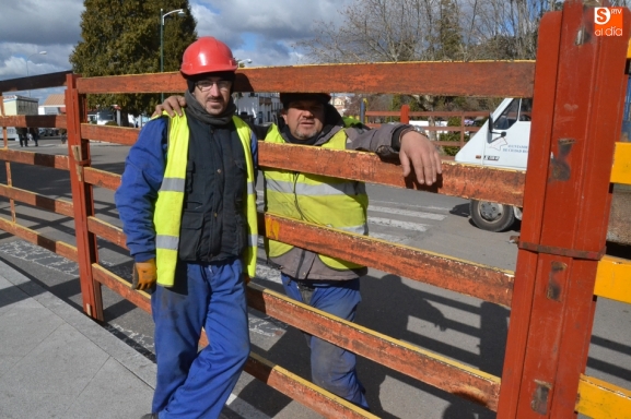 Los operarios del Ayuntamiento de Ciudad Rodrigo encargados del montaje de las agujas carnavaleras procedieron a colocar en la mañana del miércoles las 'últimas' del recorrido, que son las que se instalan en la Glorieta del Árbol Gordo que más molestias causan al tráfico (por lo que se dejan para el último momento).