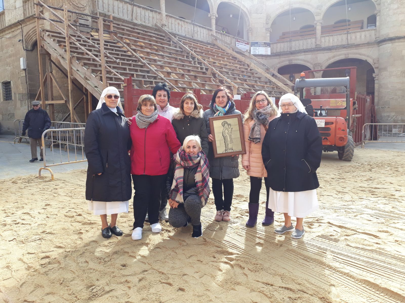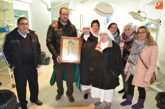 Varias hermanas de la Congregación de las Siervas de María que gestiona el Hospital de la Pasión, junto a varias trabajadoras del centro, cumplieron en la mañana del jueves con la tradición de llevar hasta la enfermería de la Plaza (situada en los bajos de la Casa Consistorial) un cuadro de la Virgen de la Salud que tienen en el centro.
