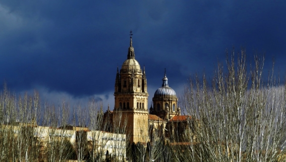 Tras de una cortina, delicada y desnuda, de chopos, las torres se levantan hacia un cielo purísimo. Azul de Salamanca, que ya viera José Hierro.