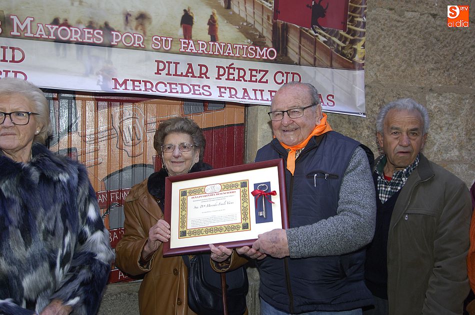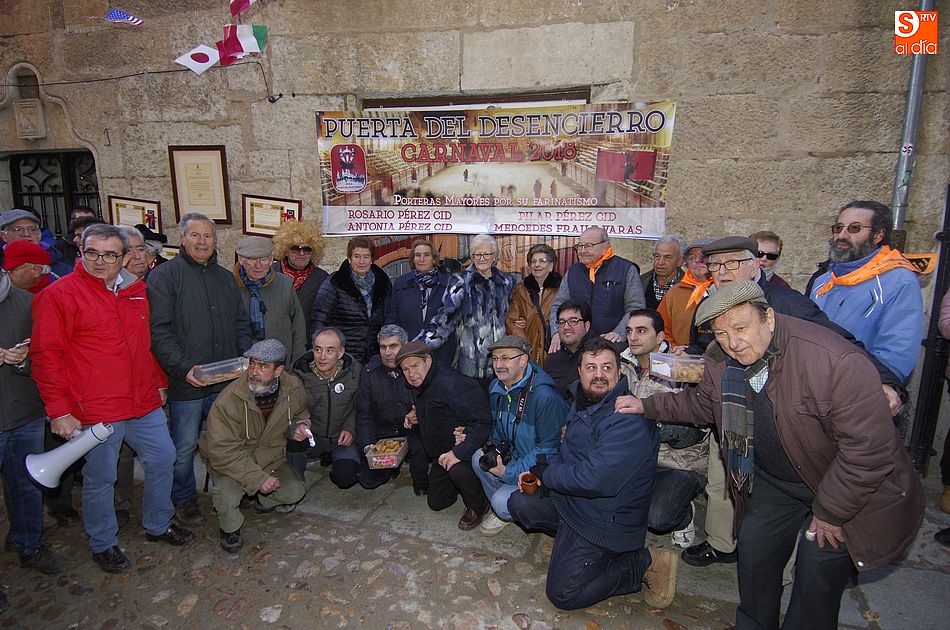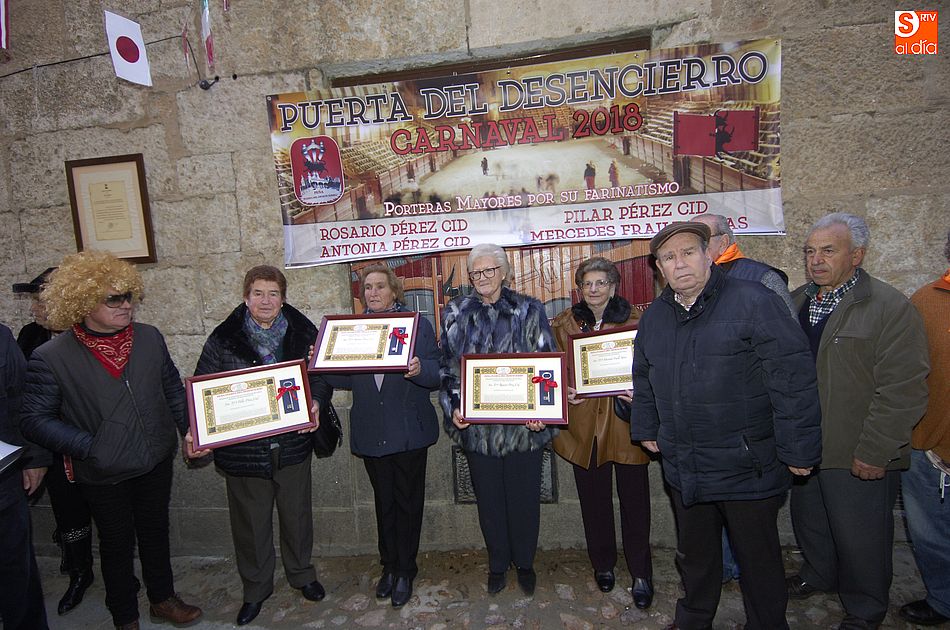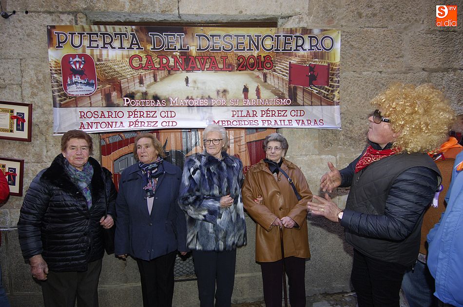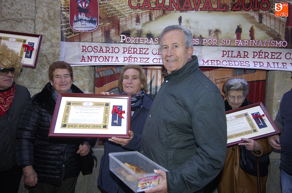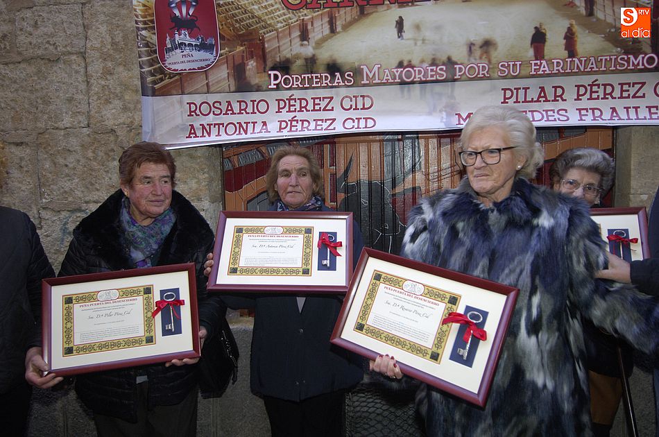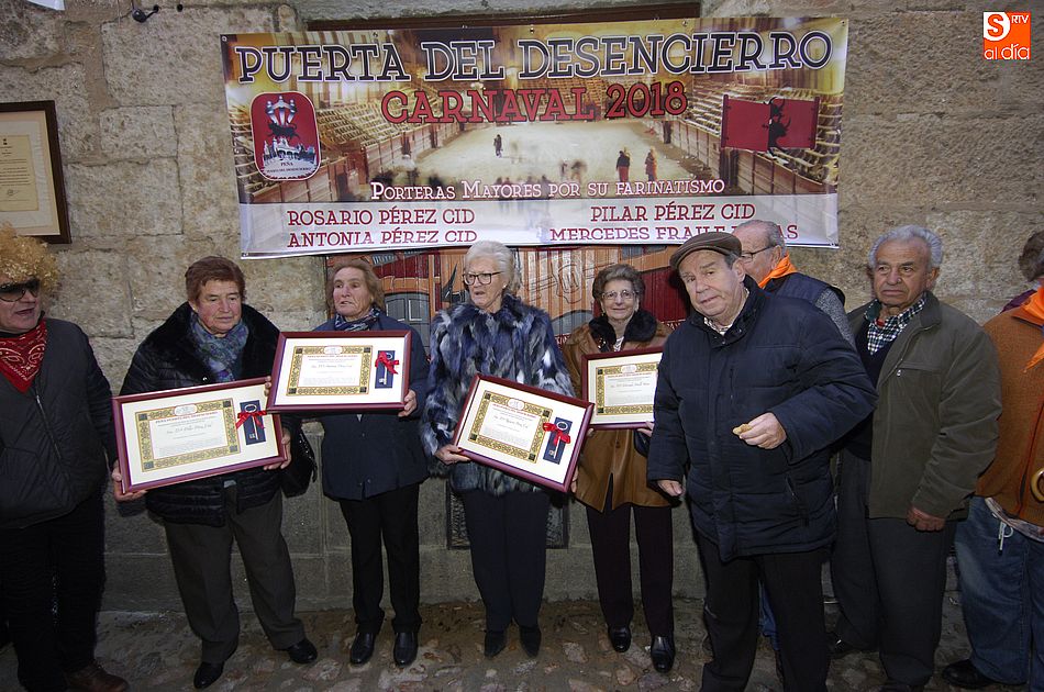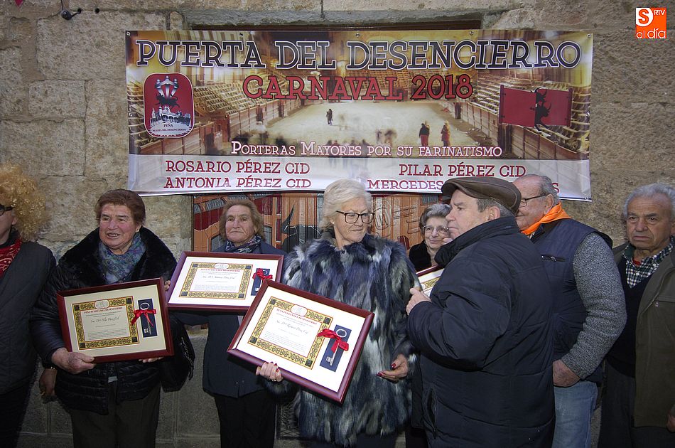 El peculiar desarrollo del encierro de la mañana del Lunes de Carnaval hizo que la Peña Puerta del Desencierro realizase su tradicional homenaje a sus Porteros Mayores de este año cuando todavía no se había dado por finalizado el encierro.