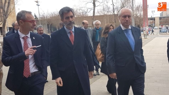 El presidente del CGPJ, acompañado por el rector de la USAL, Ricardo Rivero y por José Luis Concepción, presidente del Tribunal Superior de Justicia de Castilla y León, también se refirió al proceso judicial de los independentistas catalanes en prisión, afirmando que es difícil saber cuándo se les juzgará porque se está desarrollando la instrucción y, hasta que no finalice, "es difícil aventurar fechas".