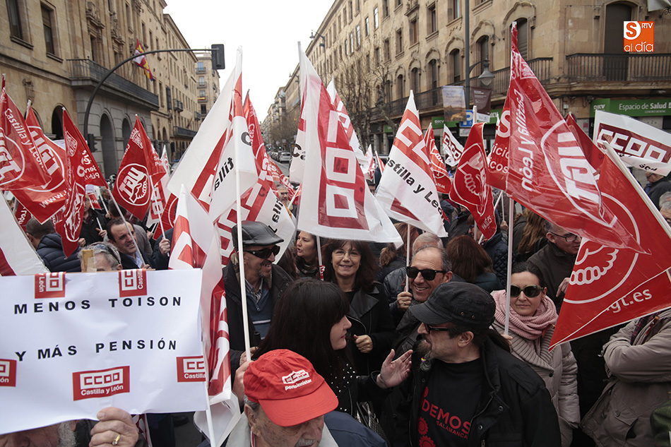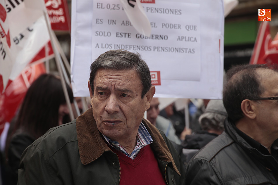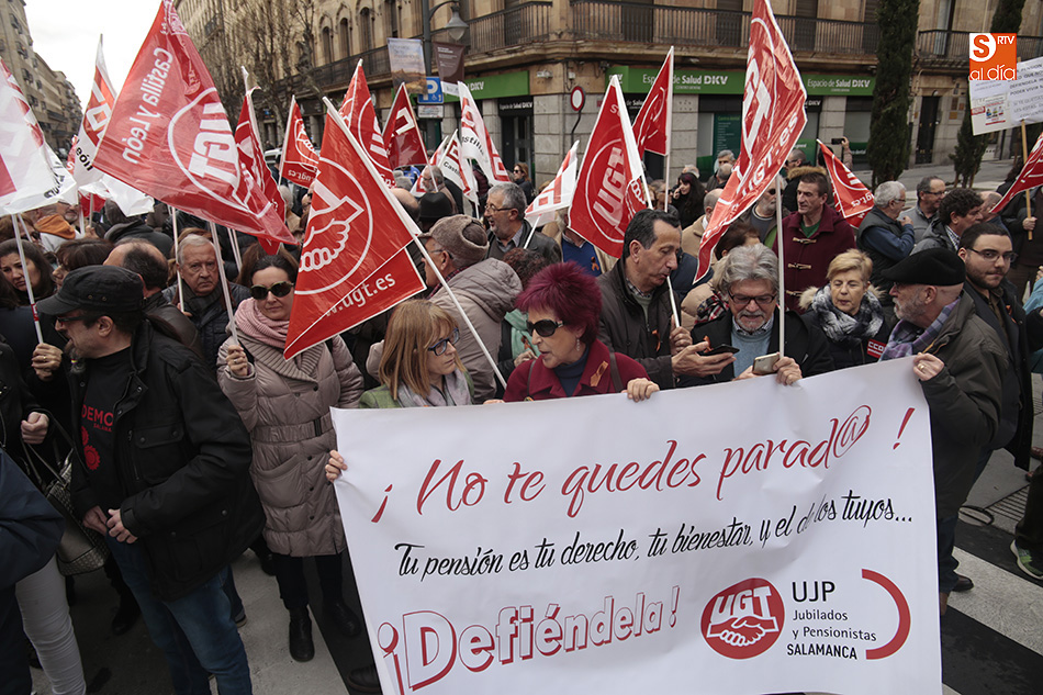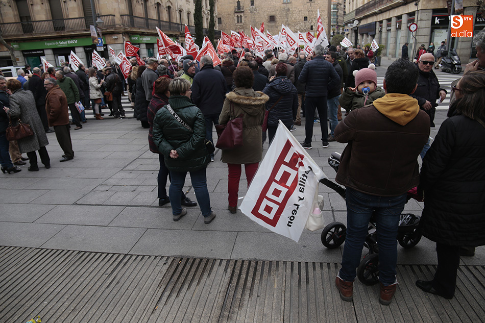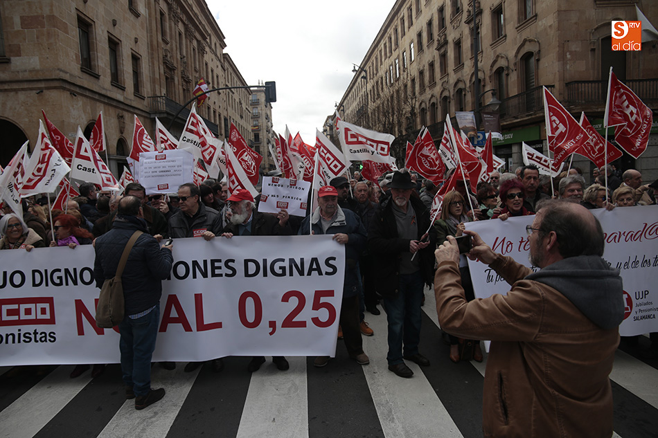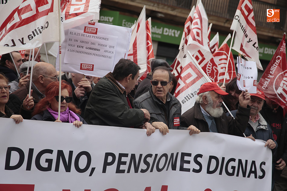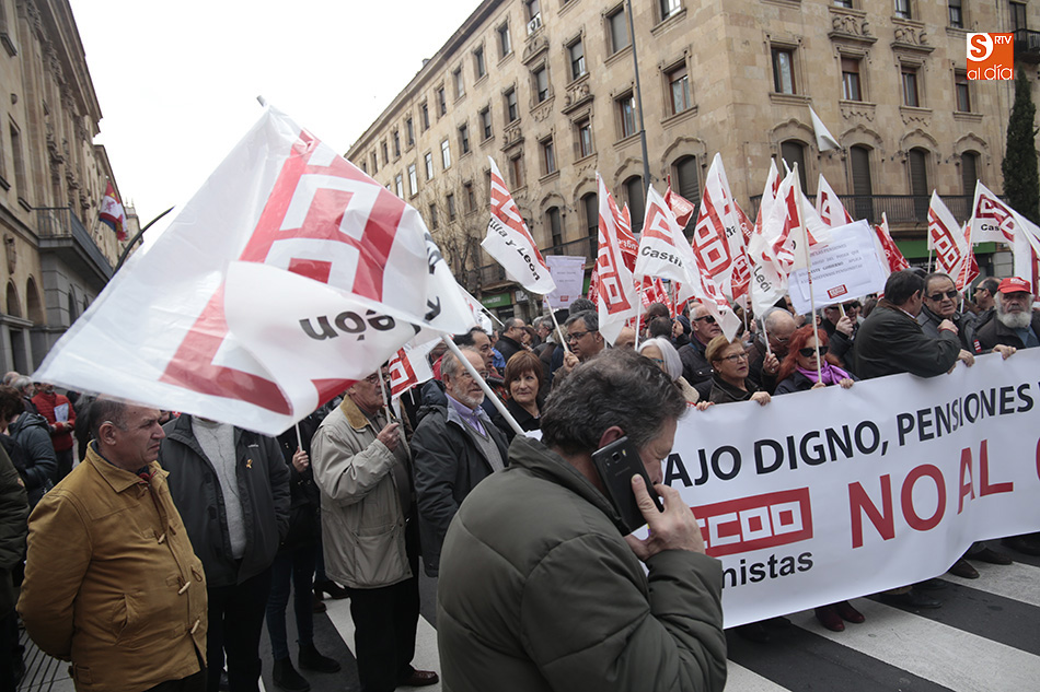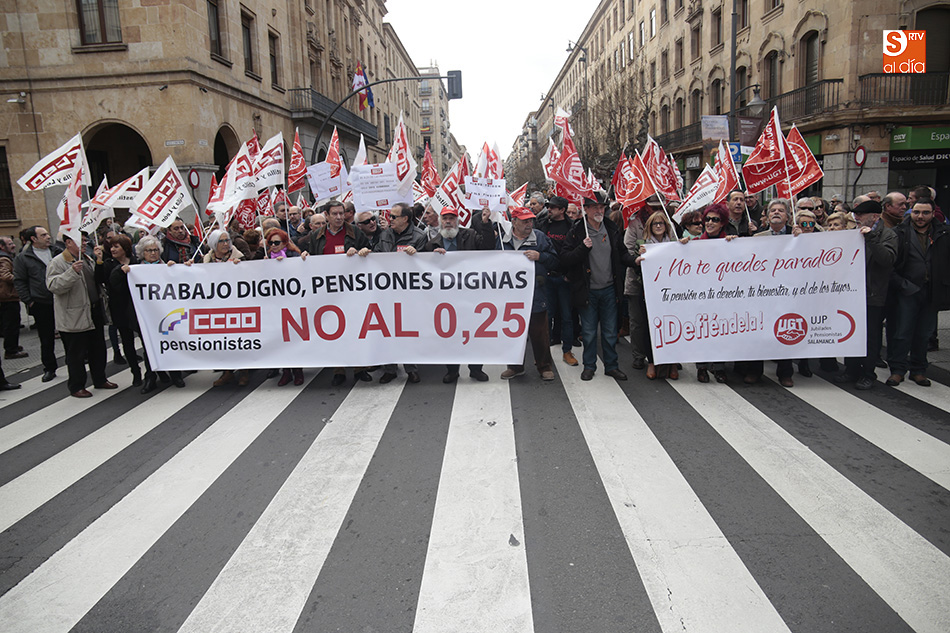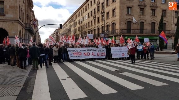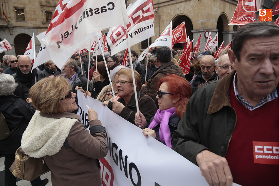 Los sindicatos UGT y CCOO se han concentrado al mediodía, y durante una hora, a las puertas de la Subdelegación del Gobierno para exigir a Rajoy una "subida digna de las pensiones" para los 9,5 millones de pensionistas en España. Al lema de la convocatoria, 'Por un trabajo digno, pensiones dignas y no al 0,25%', se unieron gritos como 'Menos corrupción, más pensión' por los más de 100 jubilados que, entre las 12.00 y las 13.00 horas cortaron la Gran Vía. A la concentración, realizada por ambos sindicatos, se han sumado concejales del Grupo Municipal de Salamanca.