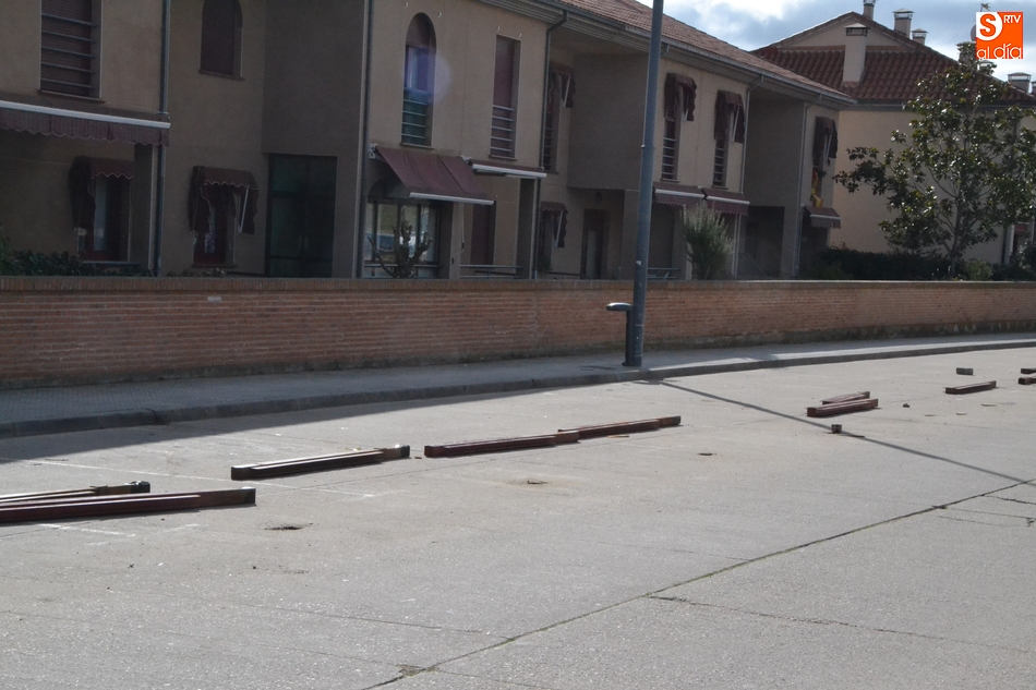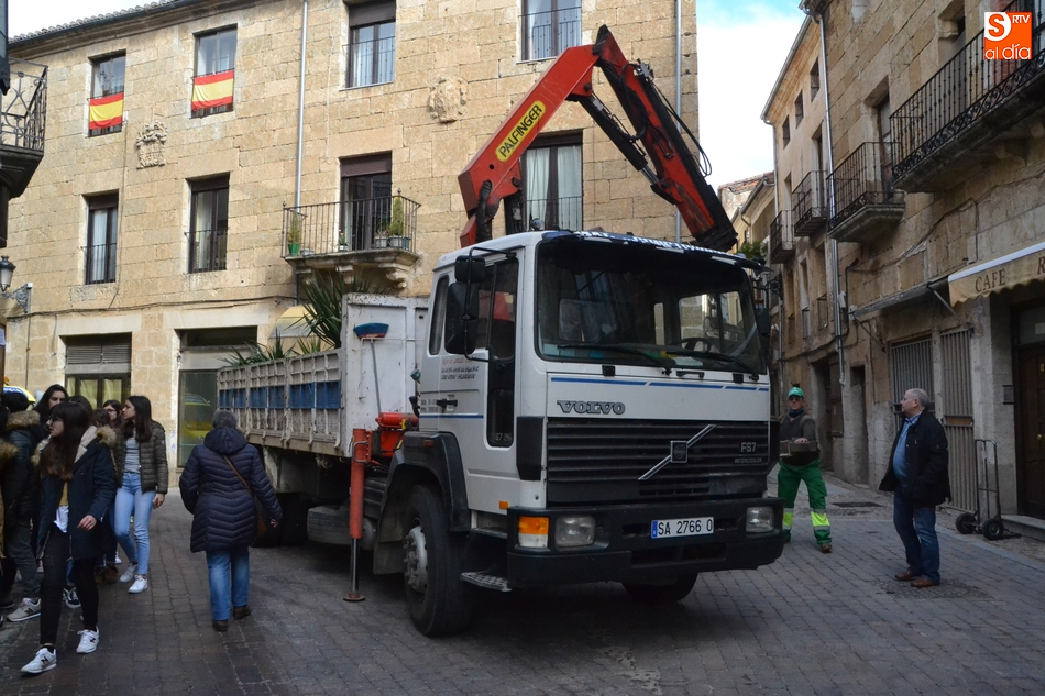 El equipo de operarios encargado de la instalación y retirada de las agujas carnavaleras completó en la mañana del viernes el desmontaje de todas las que se habían instalado en la calle Madrid, justamente en la confluencia con otras vías, como la calle Campofrío o la Plazuela del Conde.
