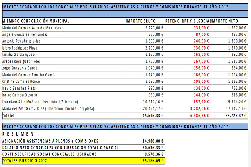 Portal de Transparencia las retribuciones percibidas por los trece concejales que componen la Corporación Municipal a lo largo del pasado año 2017.