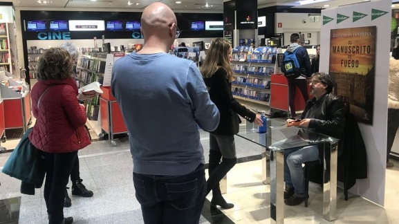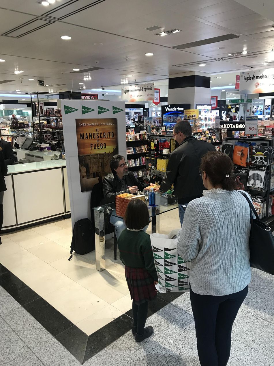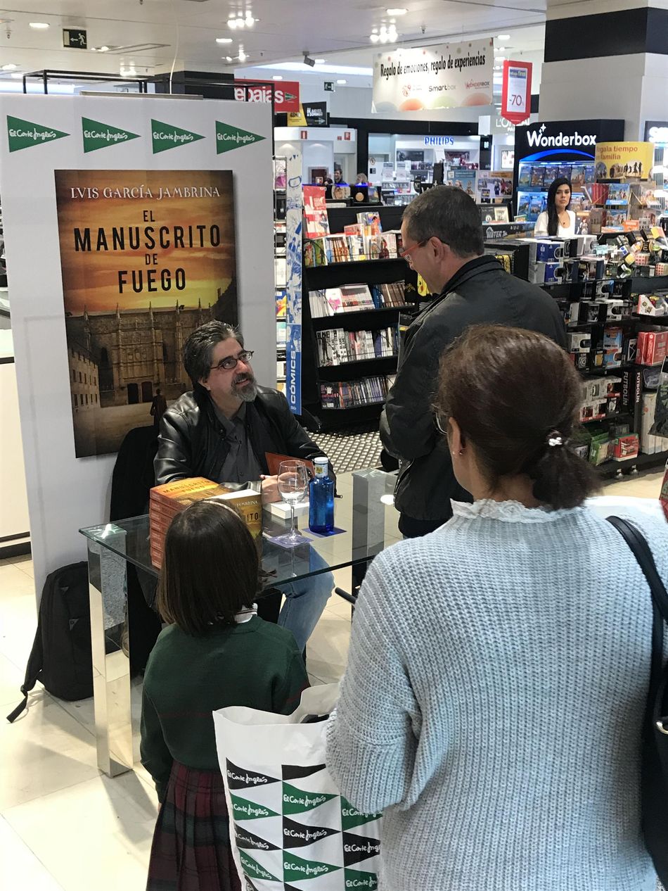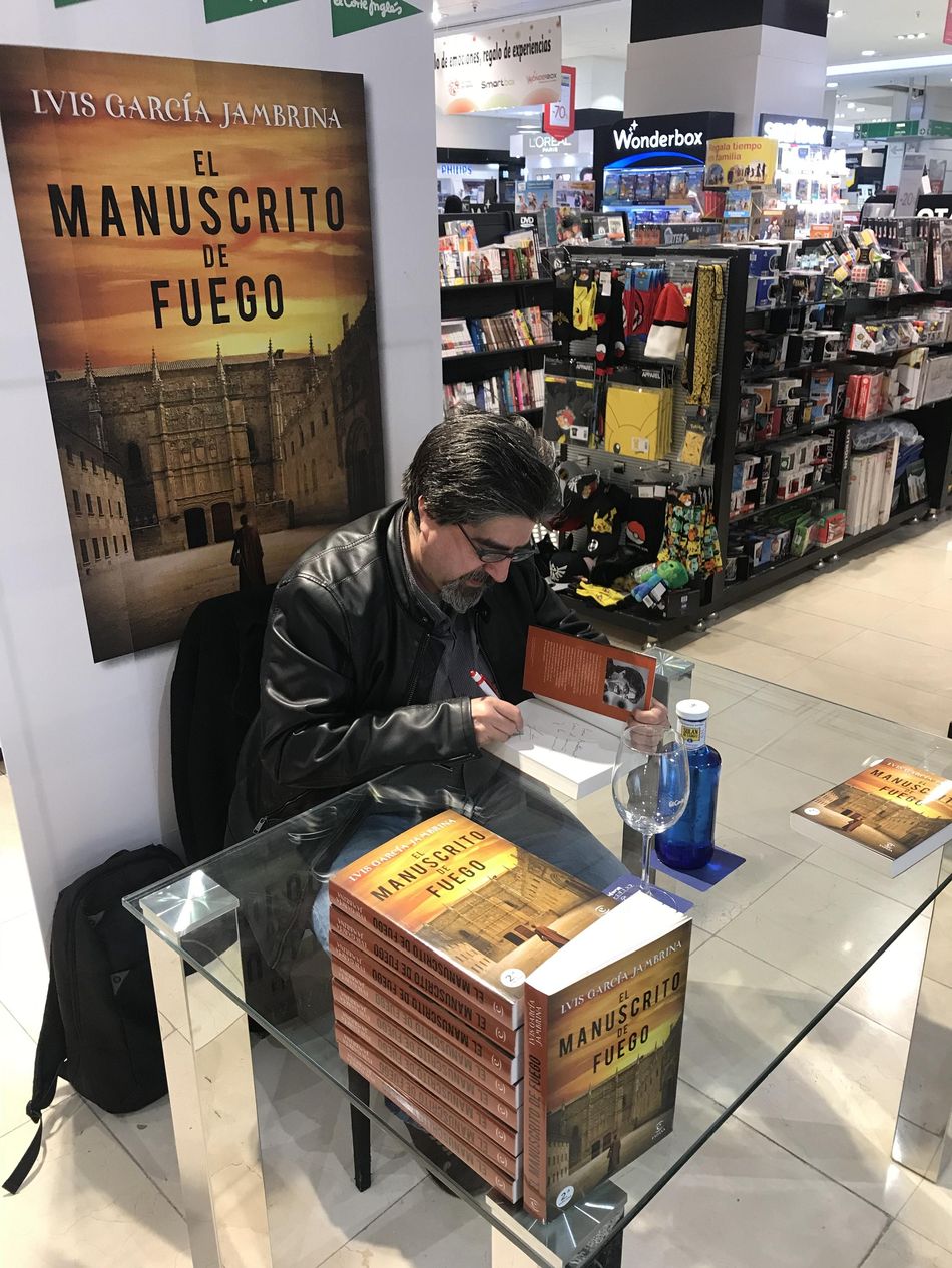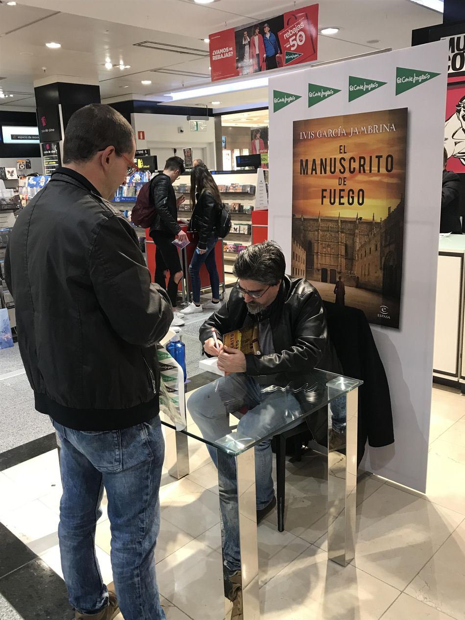 Luis García Jambrina ha estado esta tarde en departamento de Librería de la Planta Baja de El Corte Inglés de Salamanca para firmar ejemplares de su último libro, 'El Manuscrito de Fuego'. El autor ha aprovechado también la oportunidad para charlar con las personas que se han acercado para llevarse su libro dedicado e intercambiar con ellos opiniones y comentarios sobre sus obras anteriores. 'El Manuscrito de Fuego' recupera la figura de Fernando de Rojas, encargado de investigar quién asesinó a Don Francés de Zúñiga, el bufón y hombre de confianza del emperador Carlos V, acuchillado en plena noche un 2 de febrero de 1532 en Béjar.